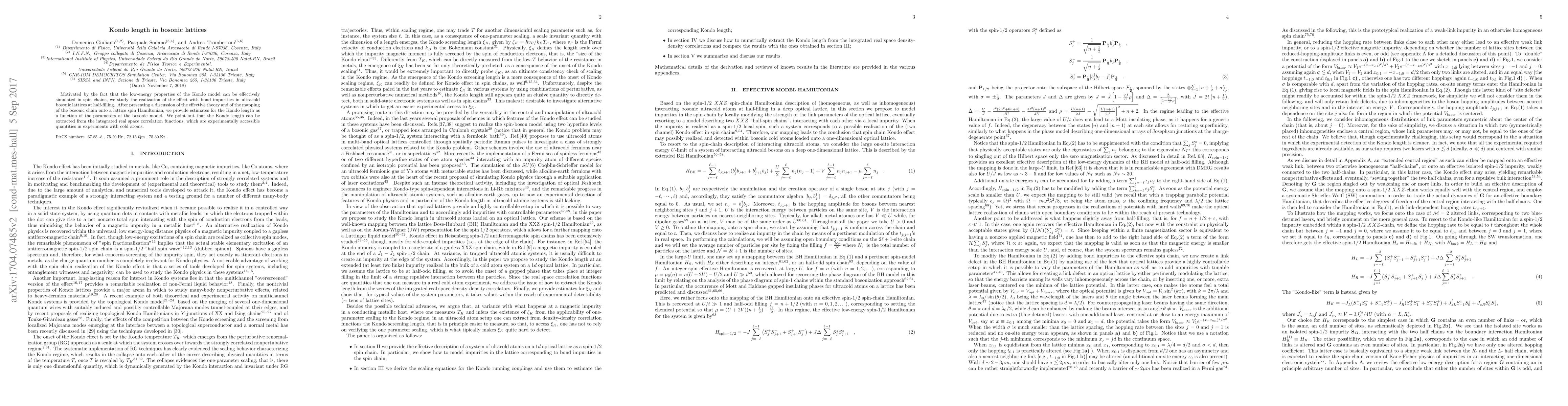Motivated by the fact that the low-energy properties of the Kondo model can be effectively simulated in spin chains, we study the realization of the effect with bond impurities in ultracold bosonic lattices at half-filling. After presenting a discussion of the effective theory and of the mapping of the bosonic chain onto a lattice spin Hamiltonian, we provide estimates for the Kondo length as a function of the parameters of the bosonic model. We point out that the Kondo length can be extracted from the integrated real space correlation functions, which are experimentally accessible quantities in experiments with cold atoms.