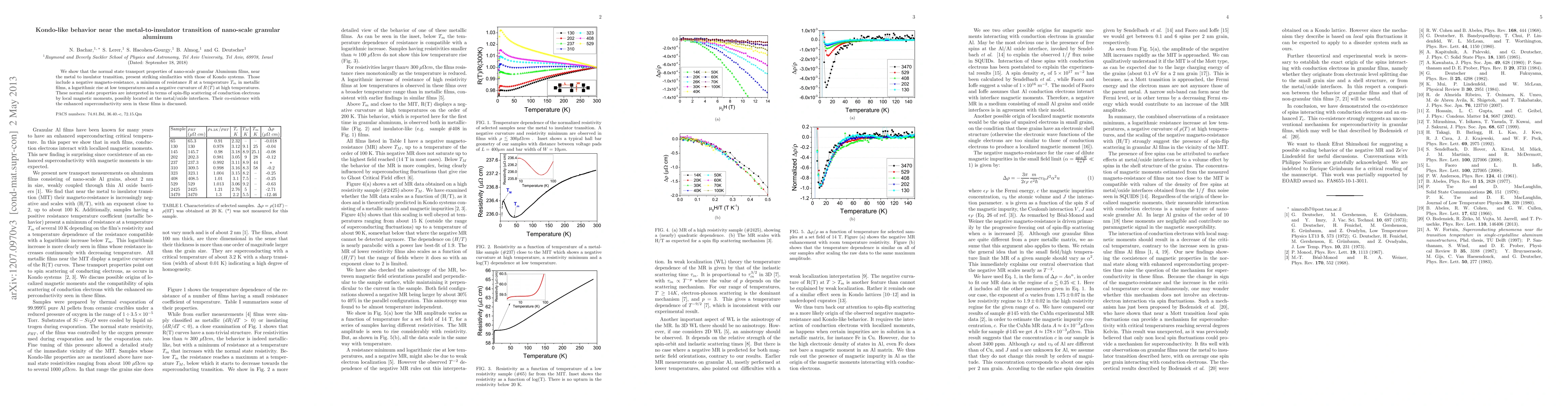 We show that the normal state transport properties of nano-scale granular Aluminum films, near the metal to insulator transition, present striking similarities with those of Kondo systems. Those include a negative magneto-resistance, a minimum of resistance R at a temperature Tm in metallic films, a logarithmic rise at low temperatures and a negative curvature of R(T) at high temperatures. These normal state properties are interpreted in terms of spin-flip scattering of conduction electrons by local magnetic moments, possibly located at the metal/oxide interfaces. Their co-existence with the enhanced superconductivity seen in these films is discussed.