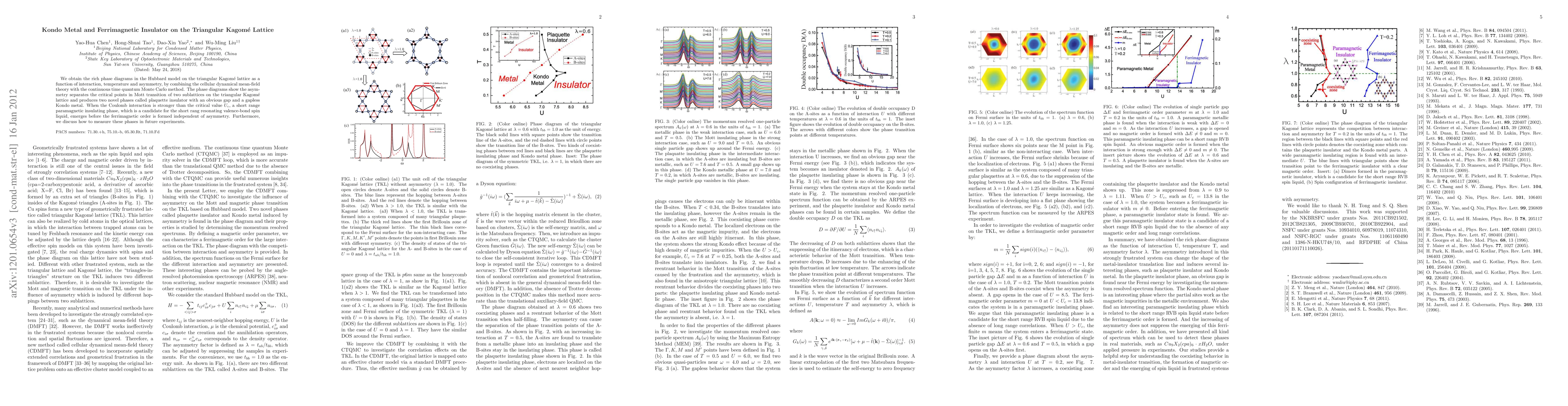 We obtain the rich phase diagrams in the Hubbard model on the triangular Kagom\'e lattice as a function of interaction, temperature and asymmetry, by combining the cellular dynamical mean-field theory with the continuous time quantum Monte Carlo method. The phase diagrams show the asymmetry separates the critical points in Mott transition of two sublattices on the triangular Kagom\'e lattice and produces two novel phases called plaquette insulator with an obvious gap and a gapless Kondo metal. When the Coulomb interaction is stronger than the critical value Uc, a short range paramagnetic insulating phase, which is a candidate for the short rang resonating valence-bond spin liquid, emerges before the ferrimagnetic order is formed independent of asymmetry. Furthermore, we discuss how to measure these phases in future experiments.