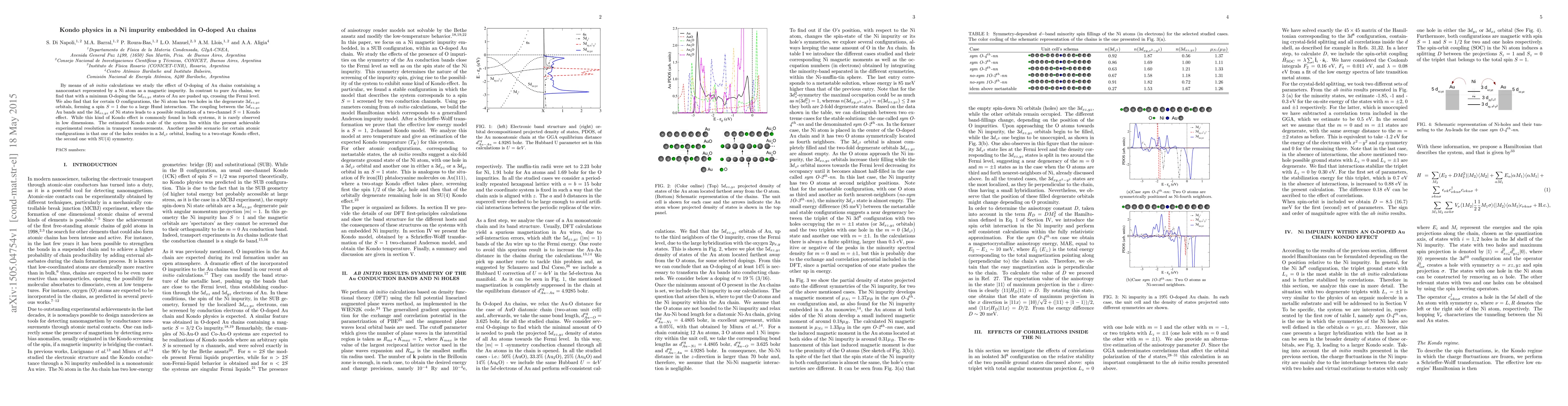 This study explores the Kondo effect in O-doped Au chains with a Ni impurity using ab initio calculations, revealing that minimal O-doping can push Au's $5d$ states across the Fermi level. The Ni impurity may exhibit a two-channel $S=1$ Kondo effect due to the coupling between Au's $5d$ and Ni's $3d$ states, a phenomenon typically seen in bulk systems but rarely in low dimensions.