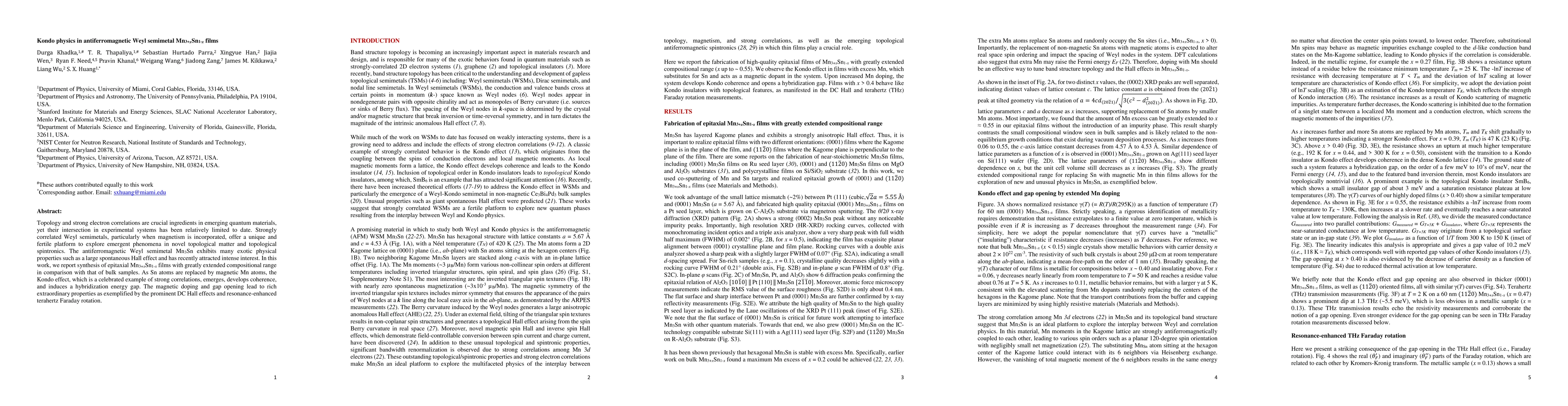 Topology and strong electron correlations are crucial ingredients in emerging quantum materials, yet their intersection in experimental systems has been relatively limited to date. Strongly correlated Weyl semimetals, particularly when magnetism is incorporated, offer a unique and fertile platform to explore emergent phenomena in novel topological matter and topological spintronics. The antiferromagnetic Weyl semimetal Mn3Sn exhibits many exotic physical properties such as a large spontaneous Hall effect and has recently attracted intense interest. In this work, we report synthesis of epitaxial Mn3+xSn1-x films with greatly extended compositional range in comparison with that of bulk samples. As Sn atoms are replaced by magnetic Mn atoms, the Kondo effect, which is a celebrated example of strong correlations, emerges, develops coherence, and induces a hybridization energy gap. The magnetic doping and gap opening lead to rich extraordinary properties as exemplified by the prominent DC Hall effects and resonance-enhanced terahertz Faraday rotation.