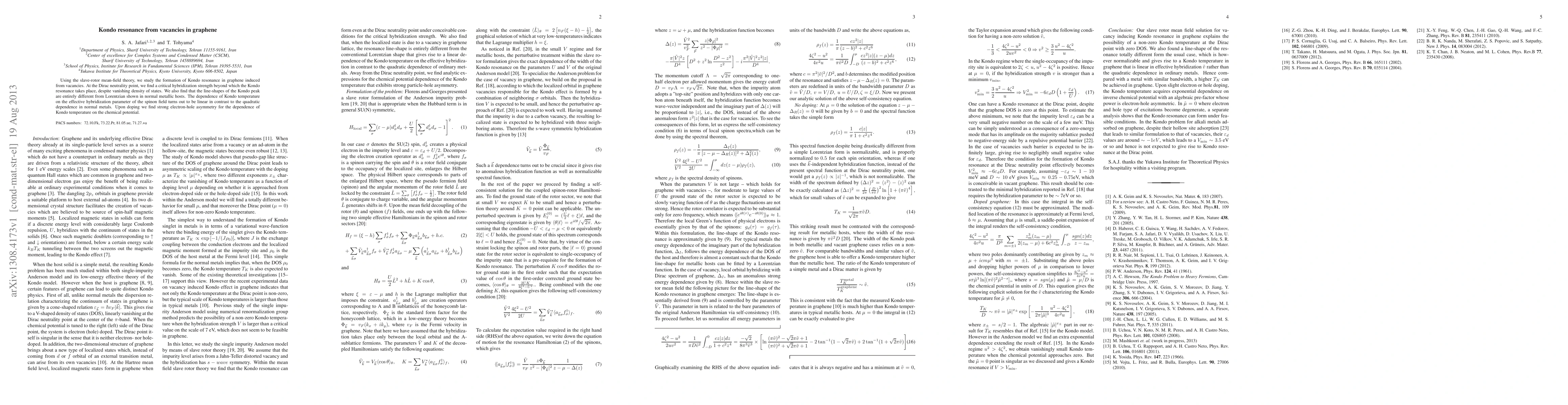 Using the slave-rotor mean-field theory, we study the formation of Kondo resonance in graphene induced from vacancies. At the Dirac neutrality point, we find acritical hybridization strength beyond which the Kondo resonance takes place, despite vanishing density of states. We also find that the line-shapes of the Kondo peak are entirely different from Lorentzian shown in normal metallic hosts. The dependence of Kondo temperature on the effective hybridization parameter of the spinon field turns out to be linear in contrast to the quadratic dependence in normal metals. Upon doping we find strong electron-hole asymmetry for the dependence of Kondo temperature on the chemical potential.