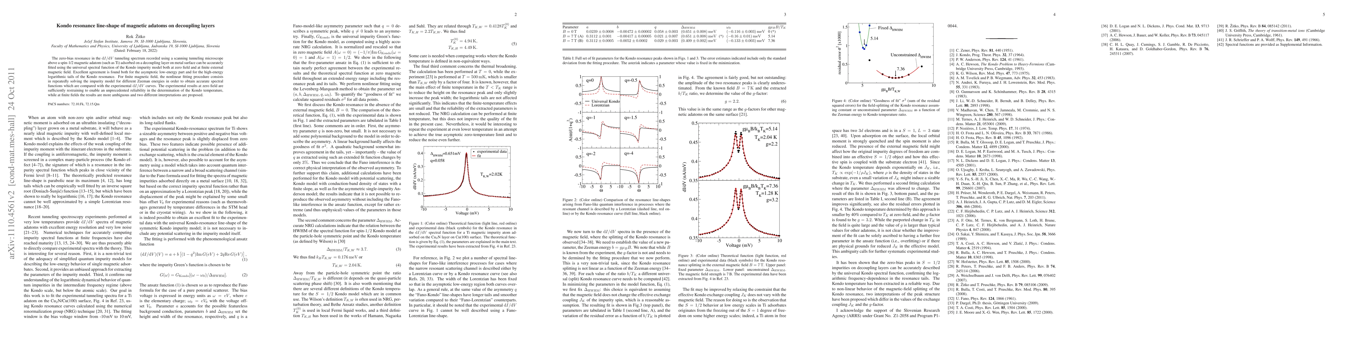The zero-bias resonance in the dI/dV tunneling spectrum recorded using a scanning tunneling microscope above a spin-1/2 magnetic adatom (such as Ti) adsorbed on a decoupling layer on metal surface can be accurately fitted using the universal spectral function of the Kondo impurity model both at zero field and at finite external magnetic field. Excellent agreement is found both for the asymptotic low-energy part and for the high-energy logarithmic tails of the Kondo resonance. For finite magnetic field, the nonlinear fitting procedure consists in repeatedly solving the impurity model for different Zeeman energies in order to obtain accurate spectral functions which are compared with the experimental dI/dV curves. The experimental results at zero field are sufficiently restraining to enable an unprecedented reliability in the determination of the Kondo temperature, while at finite fields the results are more ambiguous and two different interpretations are proposed.