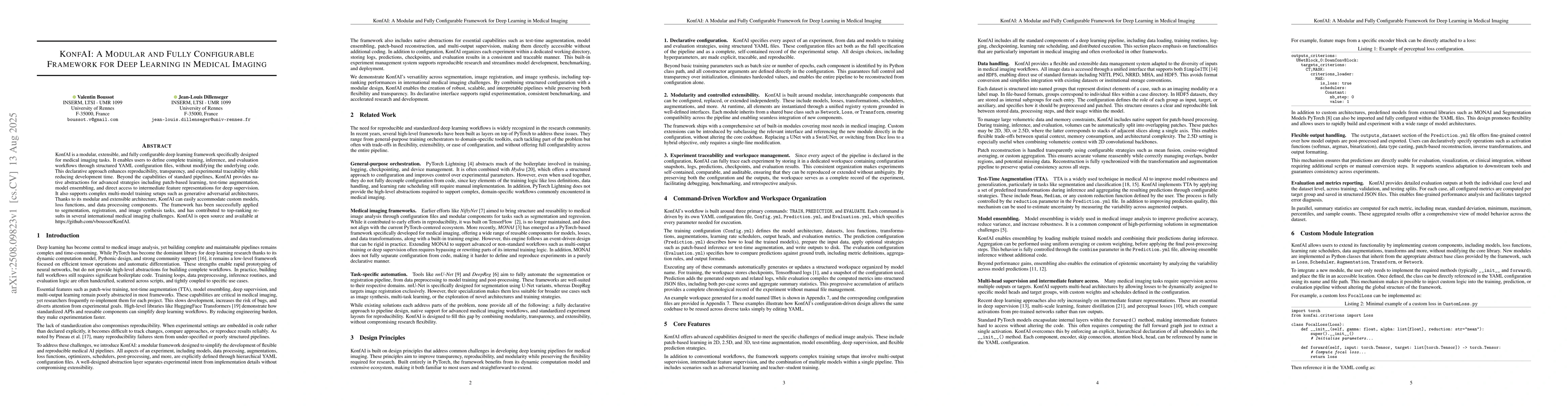KonfAI is a modular, extensible, and fully configurable deep learning framework specifically designed for medical imaging tasks. It enables users to define complete training, inference, and evaluation workflows through structured YAML configuration files, without modifying the underlying code. This declarative approach enhances reproducibility, transparency, and experimental traceability while reducing development time. Beyond the capabilities of standard pipelines, KonfAI provides native abstractions for advanced strategies including patch-based learning, test-time augmentation, model ensembling, and direct access to intermediate feature representations for deep supervision. It also supports complex multi-model training setups such as generative adversarial architectures. Thanks to its modular and extensible architecture, KonfAI can easily accommodate custom models, loss functions, and data processing components. The framework has been successfully applied to segmentation, registration, and image synthesis tasks, and has contributed to top-ranking results in several international medical imaging challenges. KonfAI is open source and available at \href{https://github.com/vboussot/KonfAI}{https://github.com/vboussot/KonfAI}.