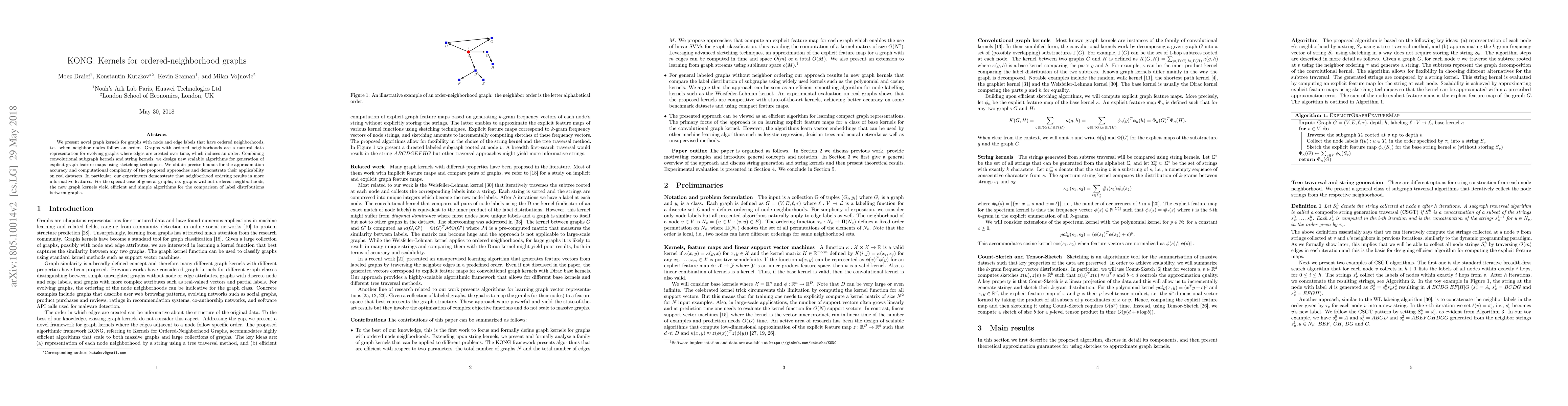 KONG presents scalable algorithms for generating explicit graph feature maps using sketching techniques, combined with convolutional subgraph kernels and string kernels for ordered neighborhood graphs.