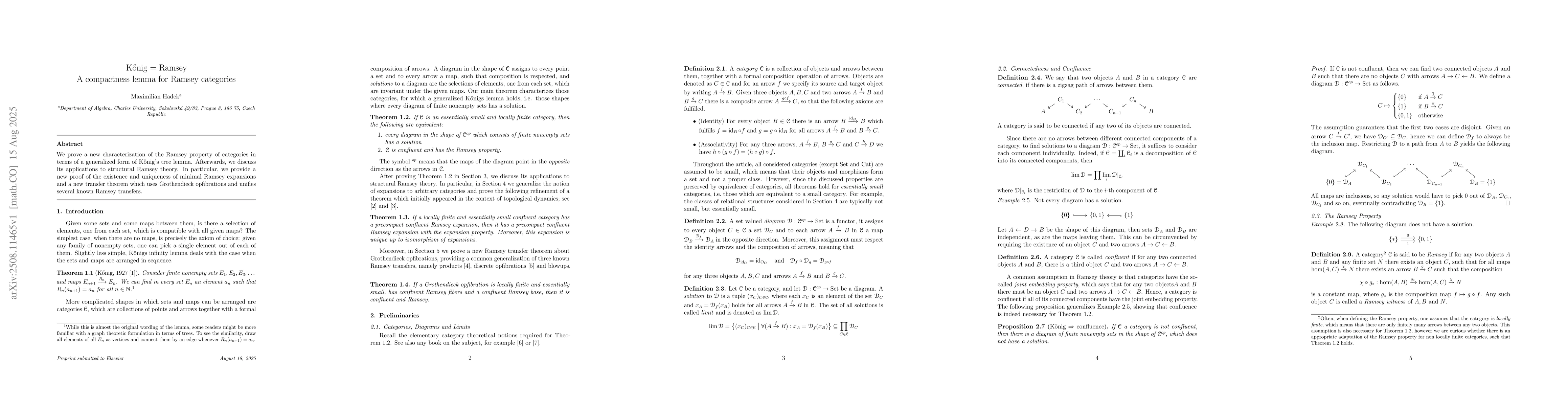 We prove a new characterization of the Ramsey property of categories in terms of a generalized form of K\H{o}nig's tree lemma. Afterwards, we discuss its applications to structural Ramsey theory. In particular, we provide a new proof of the existence and uniqueness of minimal Ramsey expansions and a new transfer theorem which uses Grothendieck opfibrations and unifies several known Ramsey transfers.