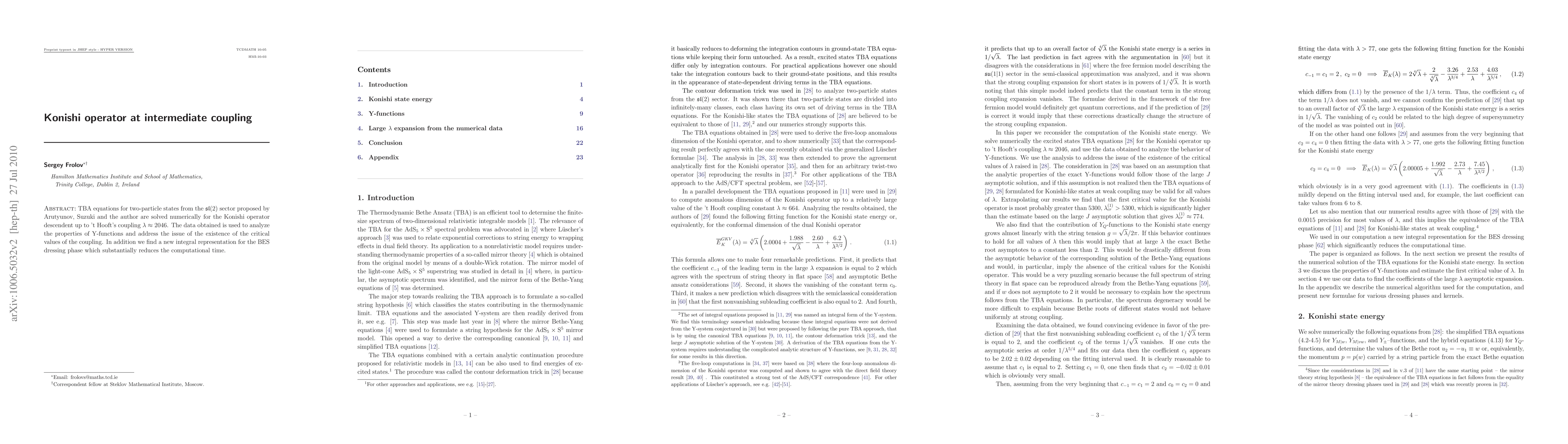 This paper numerically solves TBA equations for two-particle states in the sl(2) sector to analyze the Konishi operator at intermediate coupling values up to 't Hooft's coupling λ ~ 2046, revealing new insights into Y-functions and critical coupling values, and introduces a more efficient integral representation for the BES dressing phase.