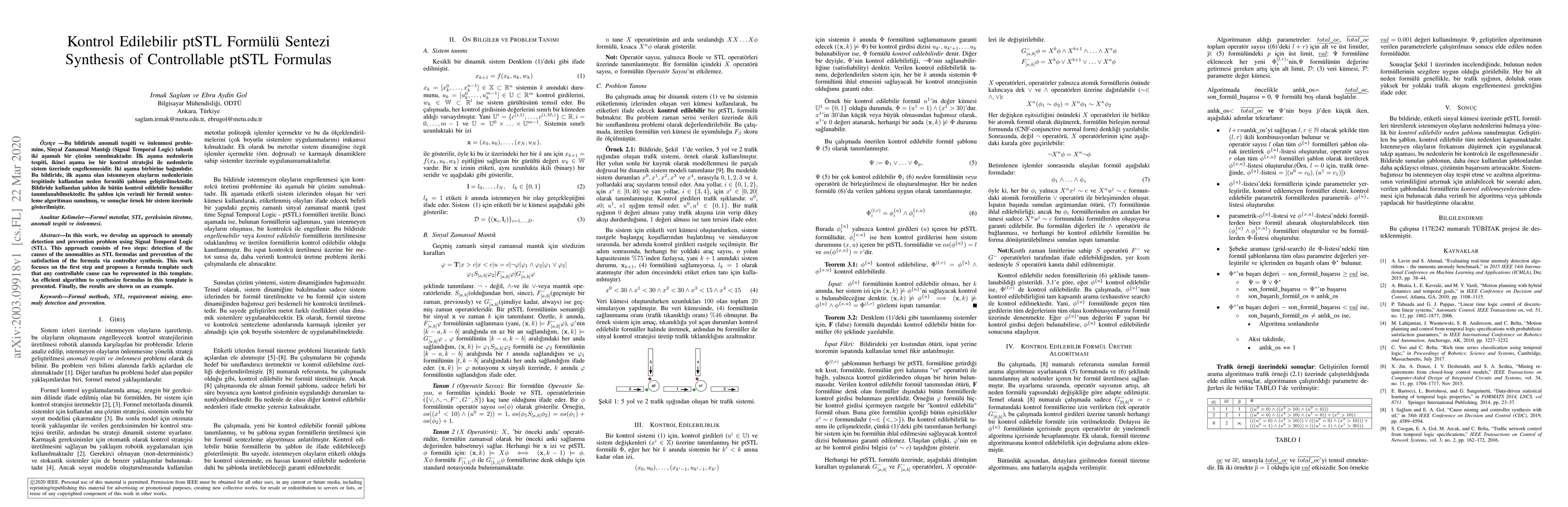 In this work, we develop an approach to anomaly detection and prevention problem using Signal Temporal Logic (STL). This approach consists of two steps: detection of the causes of the anomalities as STL formulas and prevention of the satisfaction of the formula via controller synthesis. This work focuses on the first step and proposes a formula template such that any controllable cause can be represented in this template. An efficient algorithm to synthesize formulas in this template is presented. Finally, the results are shown on an example. ----- Bu bildiride anomali tespiti ve onlenmesi problemine, Sinyal Zamansal Mantigi (Signal Temporal Logic) tabanli iki asamali bir cozum sunulmaktadir. Ilk asama nedenlerin tespiti, ikinci asama ise bir kontrol stratejisi ile nedenlerin sistem uzerinde engellenmesidir. Iki asama birbirine bagimlidir. Bu bildiride, ilk asama olan istenmeyen olaylarin nedenlerinin tespitinde kullanilan neden formulu sablonu gelistirilmektedir. Bildiride kullanilan sablon ile butun kontrol edilebilir formuller tanimlanabilmektedir. Bu sablon icin verimli bir formul sentezleme algoritmasi sunulmus, ve sonuclar ornek bir sistem uzerinde gosterilmistir.
