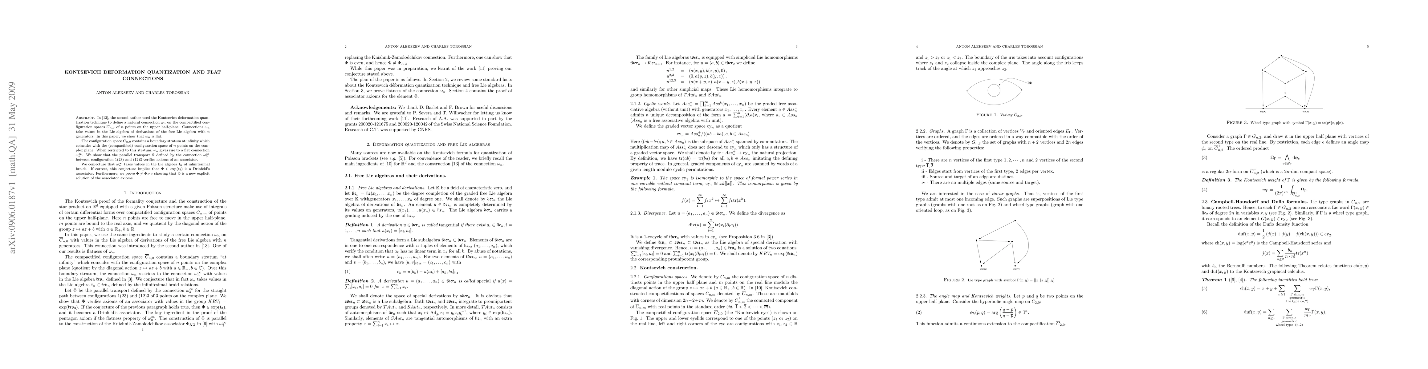 In arXiv:math/0105152, the second author used the Kontsevich deformation quantization technique to define a natural connection \omega_n on the compactified configuration spaces of n points on the upper half-plane. This connection takes values in the Lie algebra of derivations of the free Lie algebra with n generators. In this paper, we show that \omega_n is flat. The configuration space contains a boundary stratum at infinity which coincides with the (compactified) configuration space of n points on the complex plane. When restricted to this stratum, \omega_n gives rise to a flat connection \omega_n^\infty. We show that the parallel transport \Phi defined by \omega_3^\infty between configuration 1(23) and (12)3 verifies axioms of an associator. We conjecture that \omega_n^\infty takes values in the Lie algebra of infinitesimal braids. This conjecture implies that \Phi is an even Drinfeld associator defining a new explicit solution of associator axioms. A proof of this conjecture has recently appeared in arXiv:0905.1789