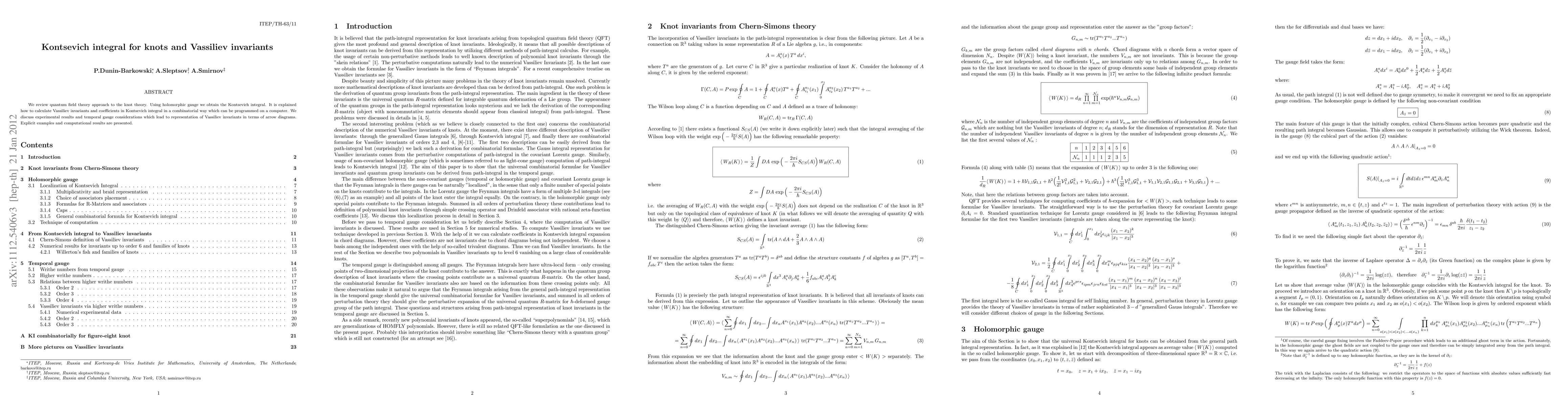 This paper reviews a quantum field theory approach to knot theory, deriving the Kontsevich integral and explaining its combinatorial calculation for Vassiliev invariants, which are represented via arrow diagrams; computational results and gauge considerations are also discussed.