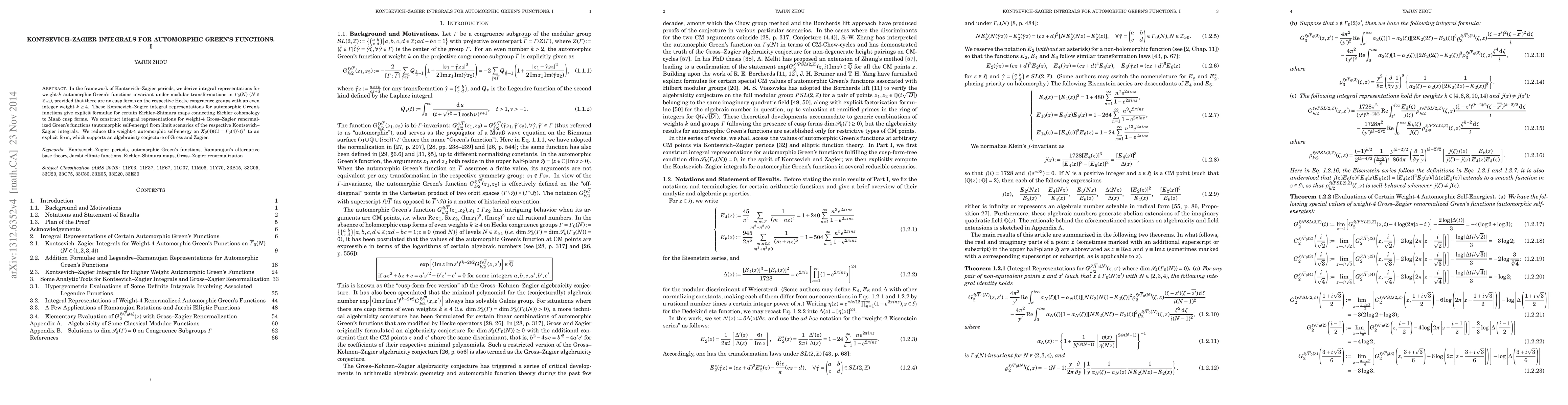 In the framework of Kontsevich-Zagier periods, we derive integral representations for weight-$k$ automorphic Green's functions invariant under modular transformations in $\varGamma_0(N)$ ($N\in\mathbb Z_{\geq1} $), provided that there are no cusp forms on the respective Hecke congruence groups with an even integer weight $k\geq4$. These Kontsevich-Zagier integral representations for automorphic Green's functions give explicit formulae for certain Eichler-Shimura maps connecting Eichler cohomology to Maa{\ss} cusp forms. We construct integral representations for weight-4 Gross-Zagier renormalized Green's functions (automorphic self-energy) from limit scenarios of the respective Kontsevich-Zagier integrals. We reduce the weight-4 automorphic self-energy on $ X_0(4)(\mathbb C)=\varGamma_0(4)\setminus\mathfrak H^*$ to an explicit form, which supports an algebraicity conjecture of Gross and Zagier.