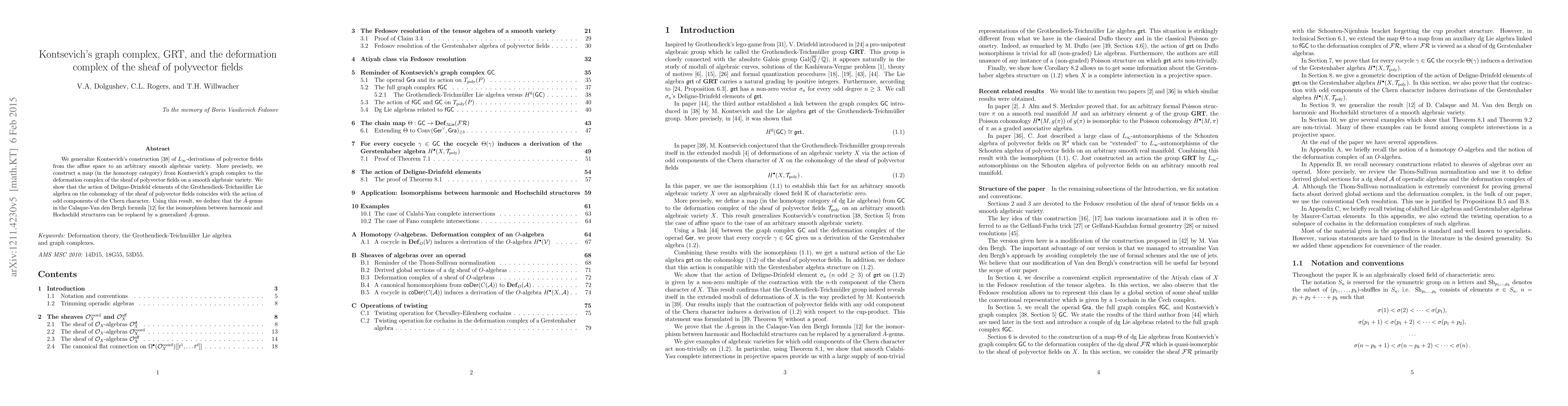 Summary: This paper generalizes Kontsevich's construction of L-infinity derivations to smooth algebraic varieties, establishing a connection between the graph complex and the deformation complex of polyvector fields, and demonstrating the equivalence of actions involving the Grothendieck-Teichmueller Lie algebra and Chern characters. It also shows that the A-hat genus in a specific formula can be substituted with a generalized version.