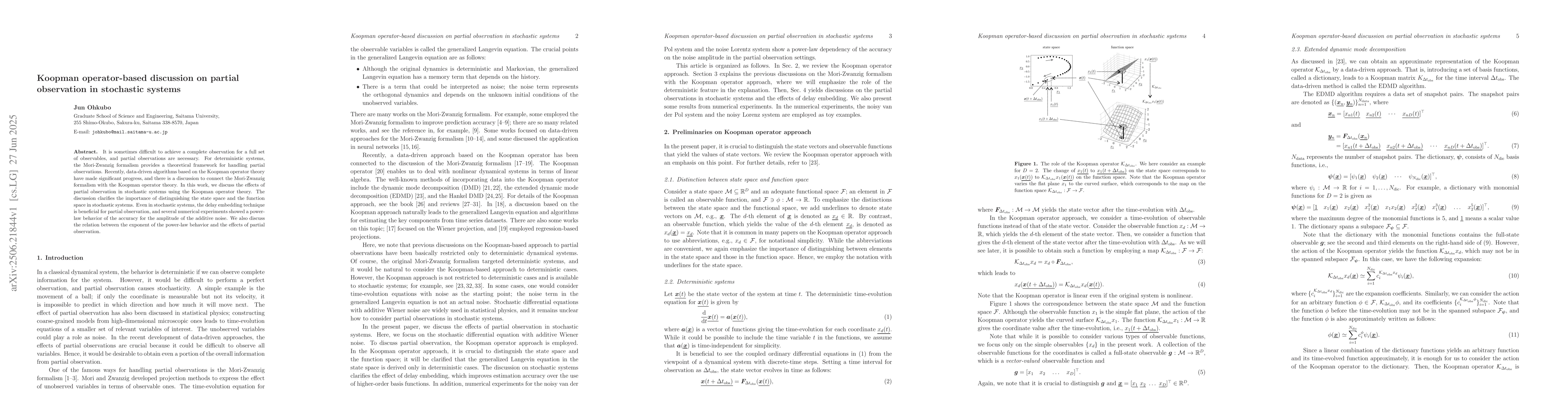It is sometimes difficult to achieve a complete observation for a full set of observables, and partial observations are necessary. For deterministic systems, the Mori-Zwanzig formalism provides a theoretical framework for handling partial observations. Recently, data-driven algorithms based on the Koopman operator theory have made significant progress, and there is a discussion to connect the Mori-Zwanzig formalism with the Koopman operator theory. In this work, we discuss the effects of partial observation in stochastic systems using the Koopman operator theory. The discussion clarifies the importance of distinguishing the state space and the function space in stochastic systems. Even in stochastic systems, the delay embedding technique is beneficial for partial observation, and several numerical experiments showed a power-law behavior of the accuracy for the amplitude of the additive noise. We also discuss the relation between the exponent of the power-law behavior and the effects of partial observation.