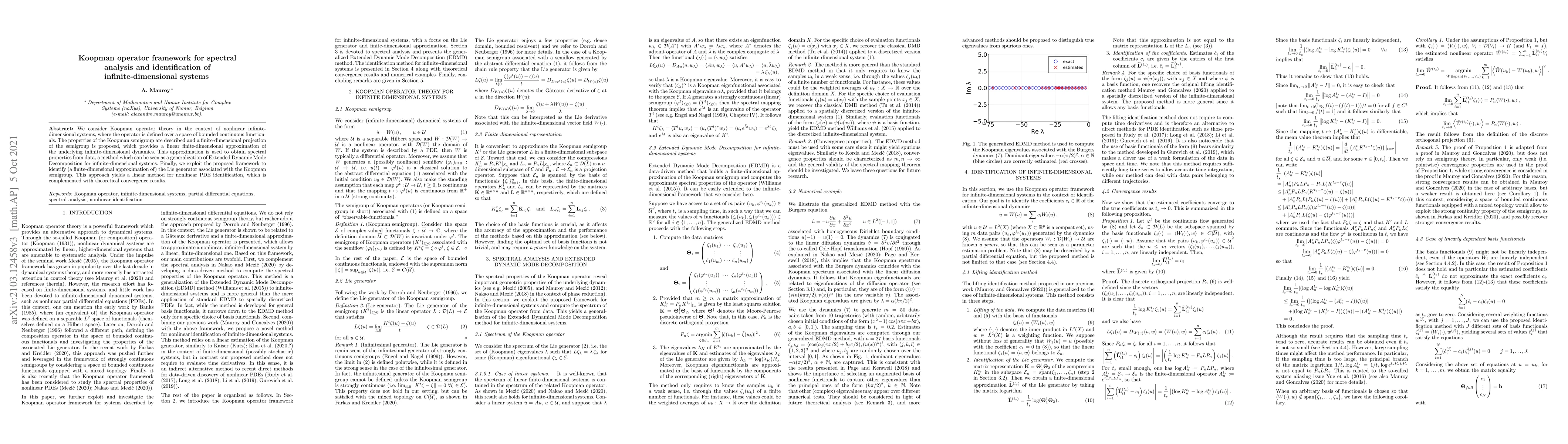 This paper proposes a Koopman operator framework for analyzing nonlinear infinite-dimensional systems, utilizing a finite-dimensional projection to approximate the underlying dynamics. This method generalizes Extended Dynamic Mode Decomposition and provides a linear approach for identifying nonlinear PDEs, supported by theoretical convergence results.
