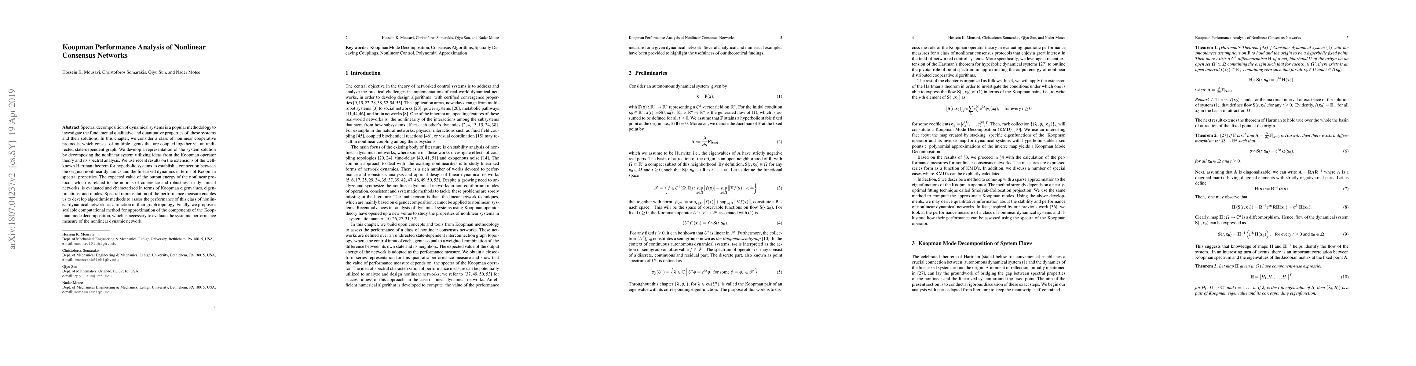 Spectral decomposition of dynamical systems is a popular methodology to investigate the fundamental qualitative and quantitative properties of these systems and their solutions. In this chapter, we consider a class of nonlinear cooperative protocols, which consist of multiple agents that are coupled together via an undirected state-dependent graph. We develop a representation of the system solution by decomposing the nonlinear system utilizing ideas from the Koopman operator theory and its spectral analysis. We use recent results on the extensions of the well-known Hartman theorem for hyperbolic systems to establish a connection between the original nonlinear dynamics and the linearized dynamics in terms of Koopman spectral properties. The expected value of the output energy of the nonlinear protocol, which is related to the notions of coherence and robustness in dynamical networks, is evaluated and characterized in terms of Koopman eigenvalues, eigenfunctions, and modes. Spectral representation of the performance measure enables us to develop algorithmic methods to assess the performance of this class of nonlinear dynamical networks as a function of their graph topology. Finally, we propose a scalable computational method for approximation of the components of the Koopman mode decomposition, which is necessary to evaluate the systemic performance measure of the nonlinear dynamic network.