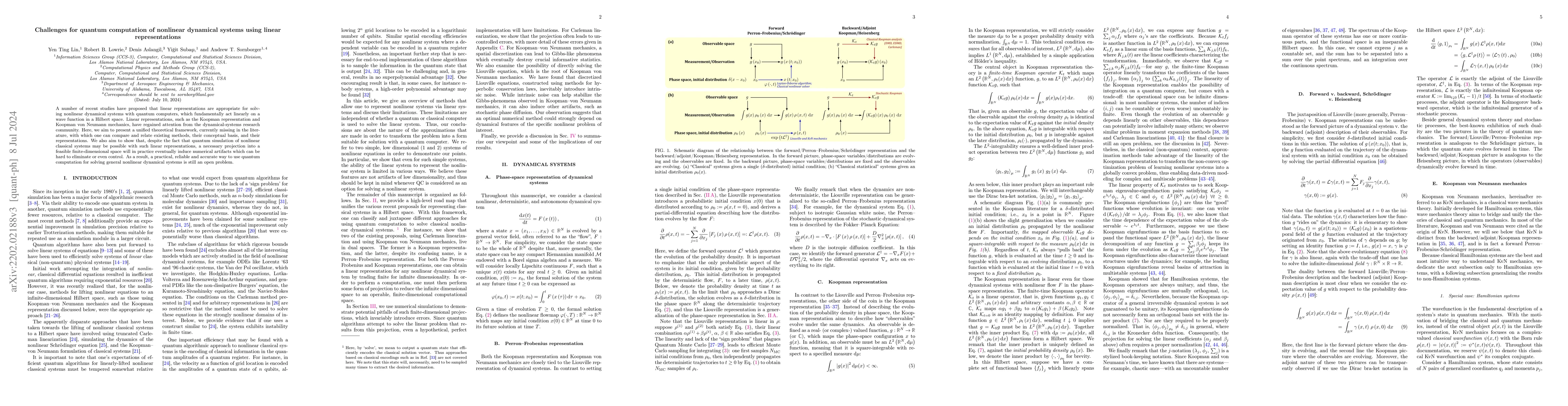 A number of recent studies have proposed that linear representations are appropriate for solving nonlinear dynamical systems with quantum computers, which fundamentally act linearly on a wave function in a Hilbert space. Linear representations, such as the Koopman representation and Koopman von Neumann mechanics, have regained attention from the dynamical-systems research community. Here, we aim to present a unified theoretical framework, currently missing in the literature, with which one can compare and relate existing methods, their conceptual basis, and their representations. We also aim to show that, despite the fact that quantum simulation of nonlinear classical systems may be possible with such linear representations, a necessary projection into a feasible finite-dimensional space will in practice eventually induce numerical artifacts which can be hard to eliminate or even control. As a result a practical, reliable and accurate way to use quantum computation for solving general nonlinear dynamical systems is still an open problem.