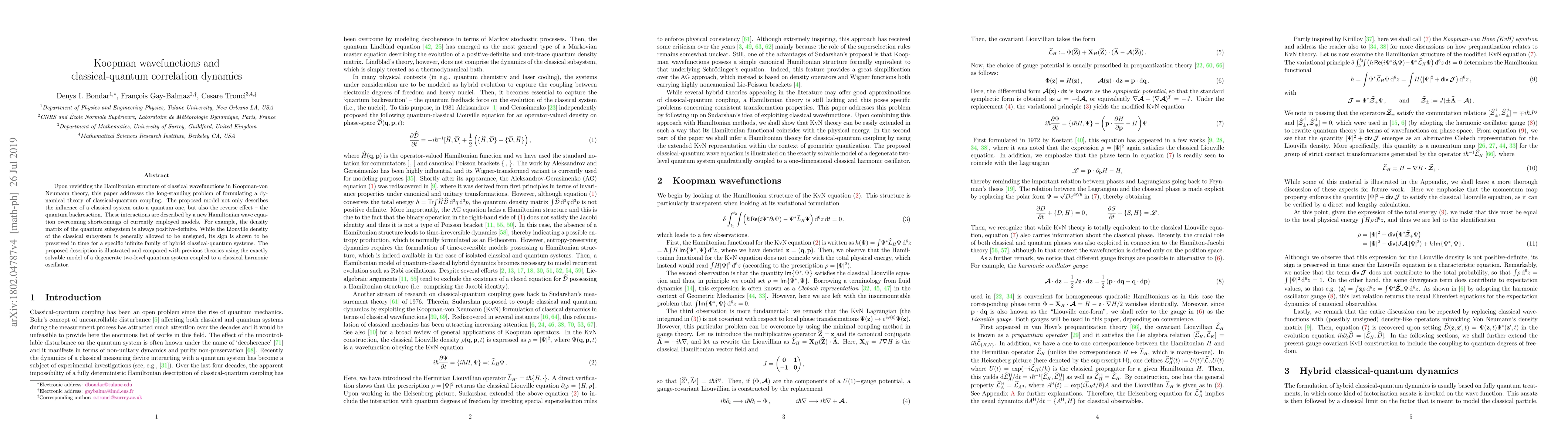Upon revisiting the Hamiltonian structure of classical wavefunctions in Koopman-von Neumann theory, this paper addresses the long-standing problem of formulating a dynamical theory of classical-quantum coupling. The proposed model not only describes the influence of a classical system onto a quantum one, but also the reverse effect -- the quantum backreaction. These interactions are described by a new Hamiltonian wave equation overcoming shortcomings of currently employed models. For example, the density matrix of the quantum subsystem is always positive-definite. While the Liouville density of the classical subsystem is generally allowed to be unsigned, its sign is shown to be preserved in time for a specific infinite family of hybrid classical-quantum systems. The proposed description is illustrated and compared with previous theories using the exactly solvable model of a degenerate two-level quantum system coupled to a classical harmonic oscillator.