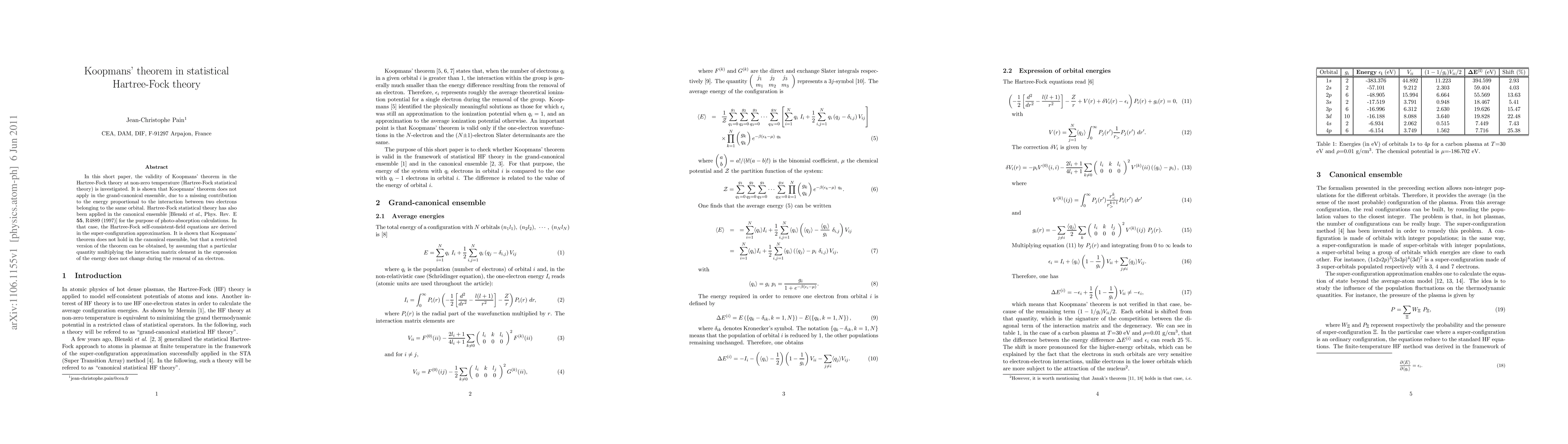 This paper investigates the applicability of Koopmans' theorem in Hartree-Fock statistical theory at non-zero temperature. It finds that the theorem does not hold in the grand-canonical ensemble due to an interaction energy term, and only a restricted version applies in the canonical ensemble under specific assumptions.