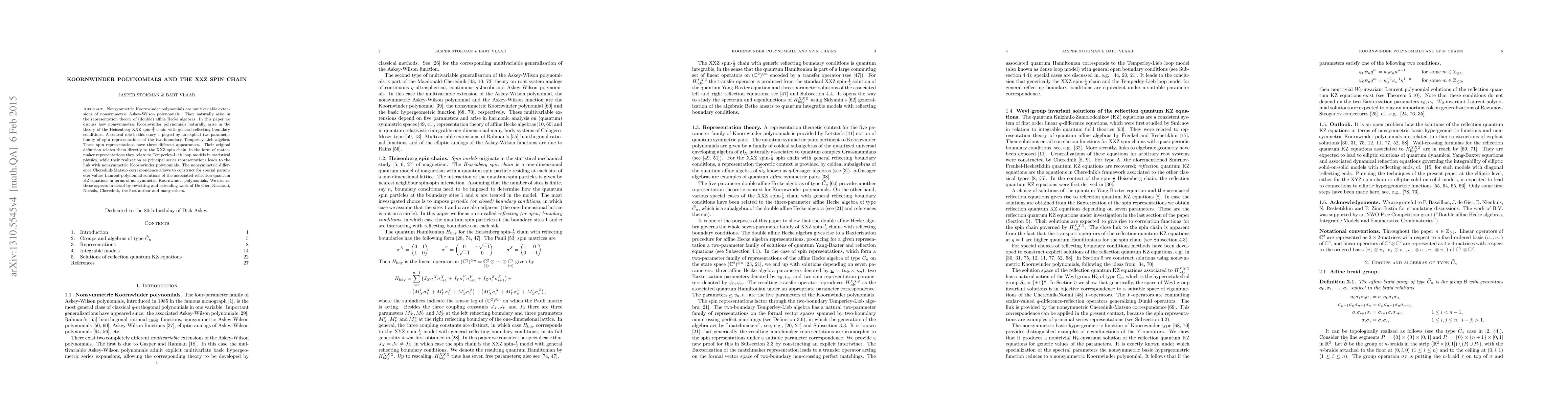 Nonsymmetric Koornwinder polynomials are multivariable extensions of nonsymmetric Askey-Wilson polynomials. They naturally arise in the representation theory of (double) affine Hecke algebras. In this paper we discuss how nonsymmetric Koornwinder polynomials naturally arise in the theory of the Heisenberg XXZ spin-$\frac{1}{2}$ chain with general reflecting boundary conditions. A central role in this story is played by an explicit two-parameter family of spin representations of the two-boundary Temperley-Lieb algebra. These spin representations have three different appearances. Their original definition relates them directly to the XXZ spin chain, in the form of matchmaker representations they relate to Temperley-Lieb loop models in statistical physics, while their realization as principal series representations leads to the link with nonsymmetric Koornwinder polynomials. The nonsymmetric difference Cherednik-Matsuo correspondence allows to construct for special parameter values Laurent-polynomial solutions of the associated reflection quantum KZ equations in terms of nonsymmetric Koornwinder polynomials. We discuss these aspects in detail by revisiting and extending work of De Gier, Kasatani, Nichols, Cherednik, the first author and many others.