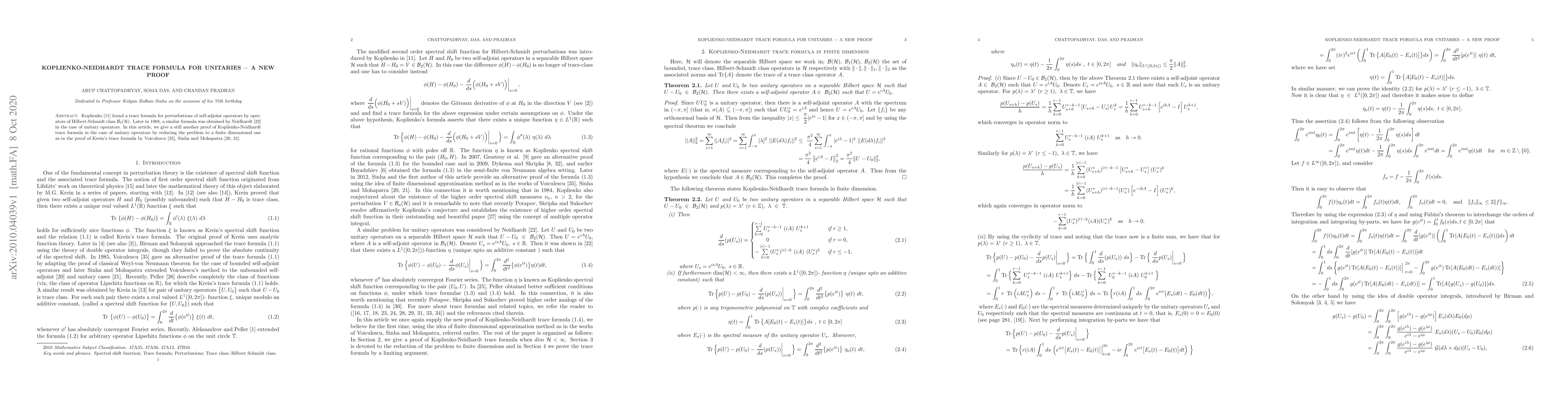 The paper presents a new proof of the Koplienko-Neidhardt trace formula for unitary operators by reducing the problem to a finite-dimensional one, similar to the proof of Krein's trace formula.