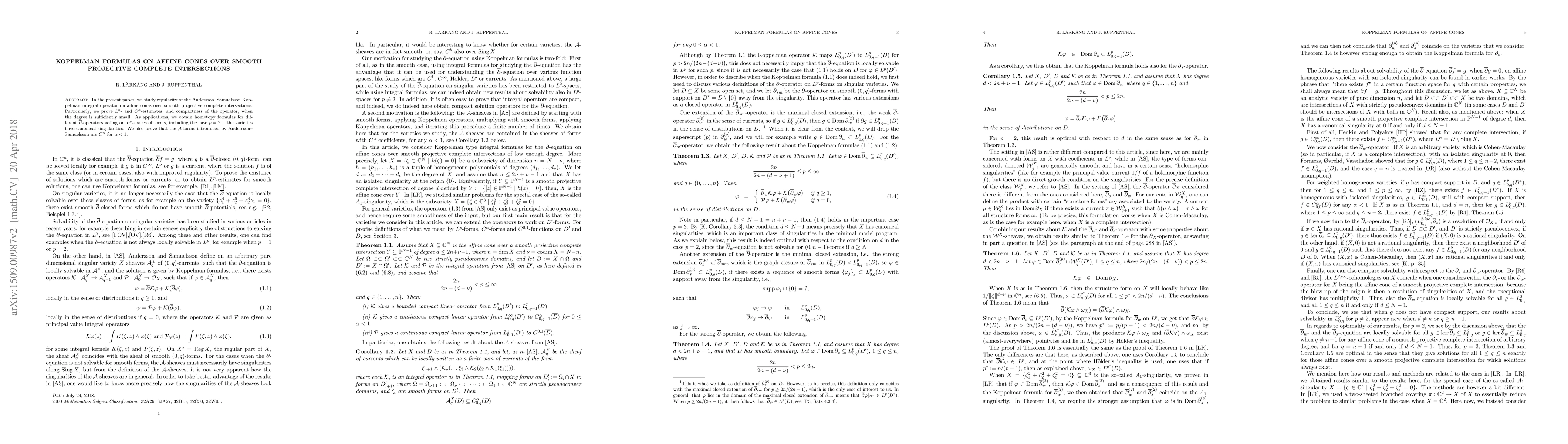 This paper investigates the regularity of the Koppelman integral operator on affine cones over smooth projective complete intersections, proving $L^p$- and $C^\alpha$-estimates and operator compactness for small degrees. It also provides homotopy formulas for $\overline{\partial}$-operators and shows $\mathcal{A}$-forms are $C^\alpha$ for $\alpha < 1$.