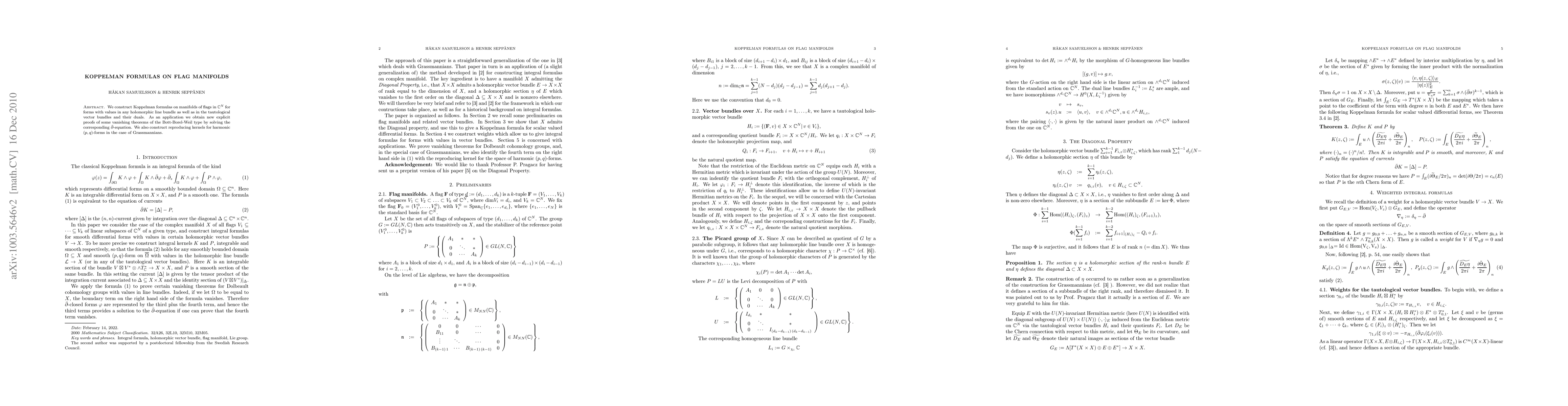 This paper constructs Koppelman formulas on flag manifolds for forms in holomorphic line bundles and tautological vector bundles, providing new proofs for Bott-Borel-Weil vanishing theorems and constructing reproducing kernels for harmonic forms on Grassmannians.