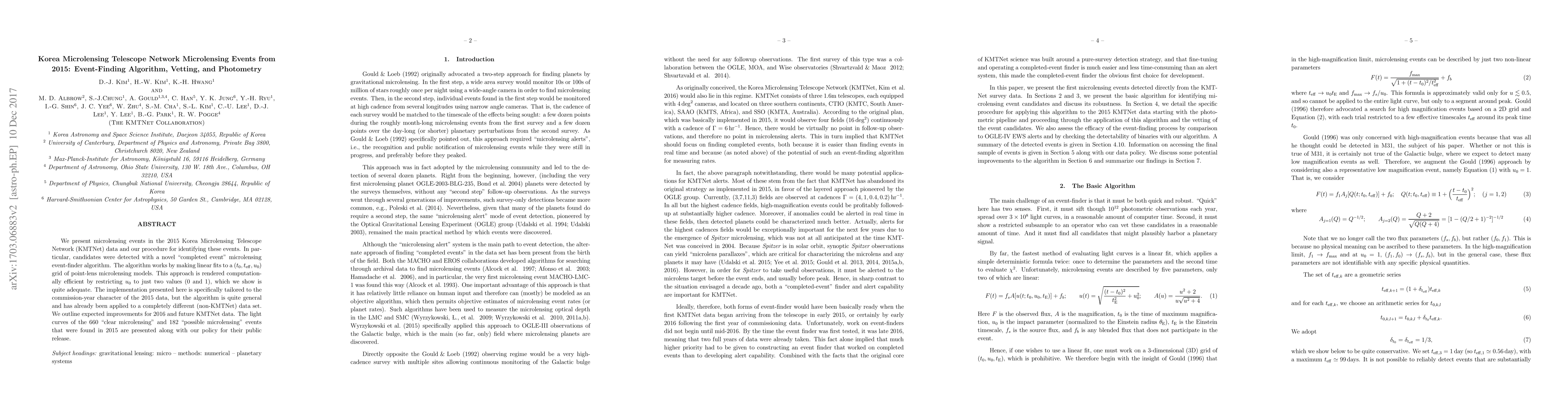 This paper details the microlensing events detected by the Korea Microlensing Telescope Network (KMTNet) in 2015 using a novel event-finding algorithm that efficiently identifies "completed event" microlensing candidates. The algorithm's success is demonstrated through the identification of 660 clear and 182 possible microlensing events, with plans for future improvements.