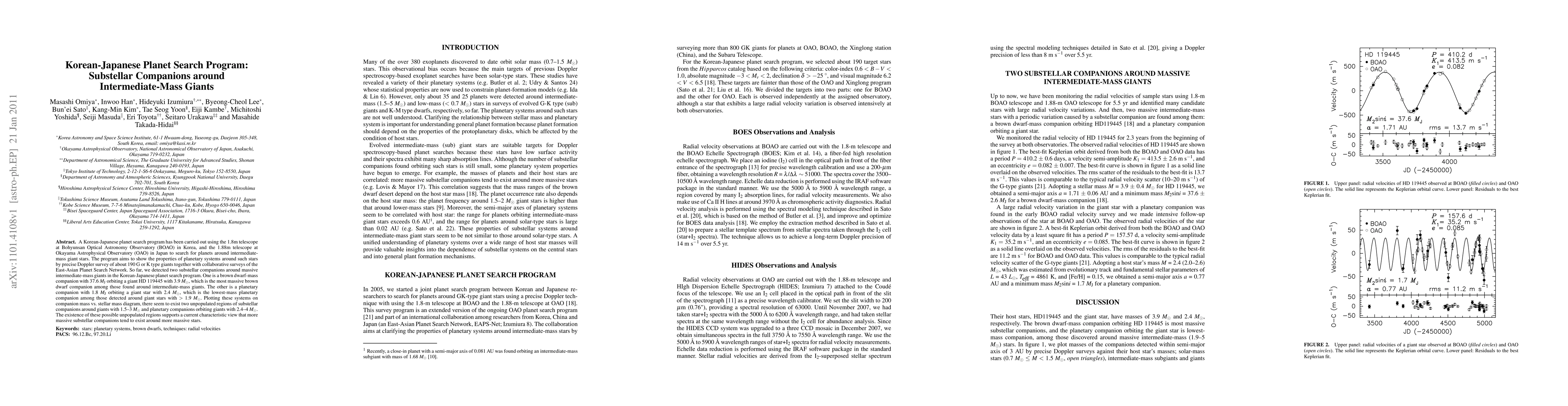 The Korean-Japanese Planet Search Program detected two substellar companions around intermediate-mass giant stars using telescopes in Korea and Japan. One is a massive brown dwarf orbiting HD 119445, and the other is a low-mass planet orbiting a giant star, revealing potential unpopulated regions in the companion mass vs. stellar mass diagram.