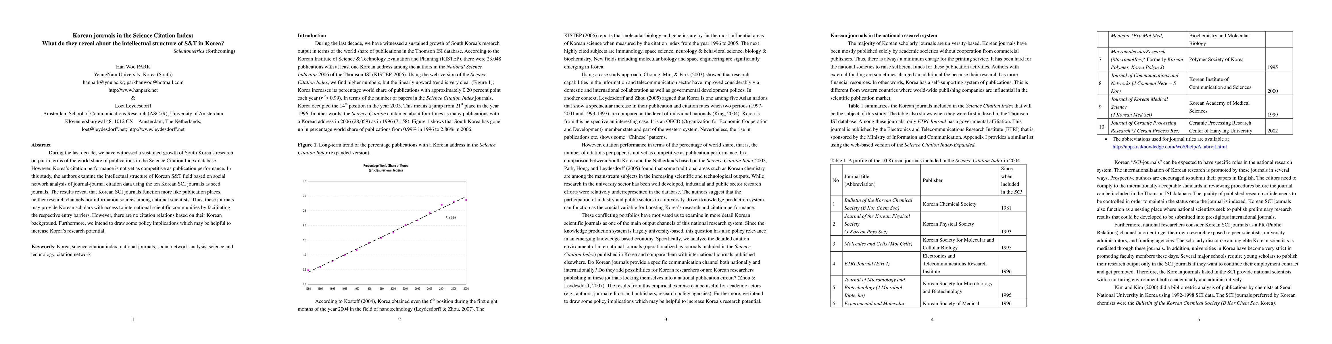 This study analyzes the intellectual structure of South Korea's science and technology (S&T) field using social network analysis of Korean journals in the Science Citation Index. The findings suggest that Korean SCI journals primarily serve as publication venues rather than research channels or information sources, indicating a need for policy adjustments to enhance Korea's research competitiveness.