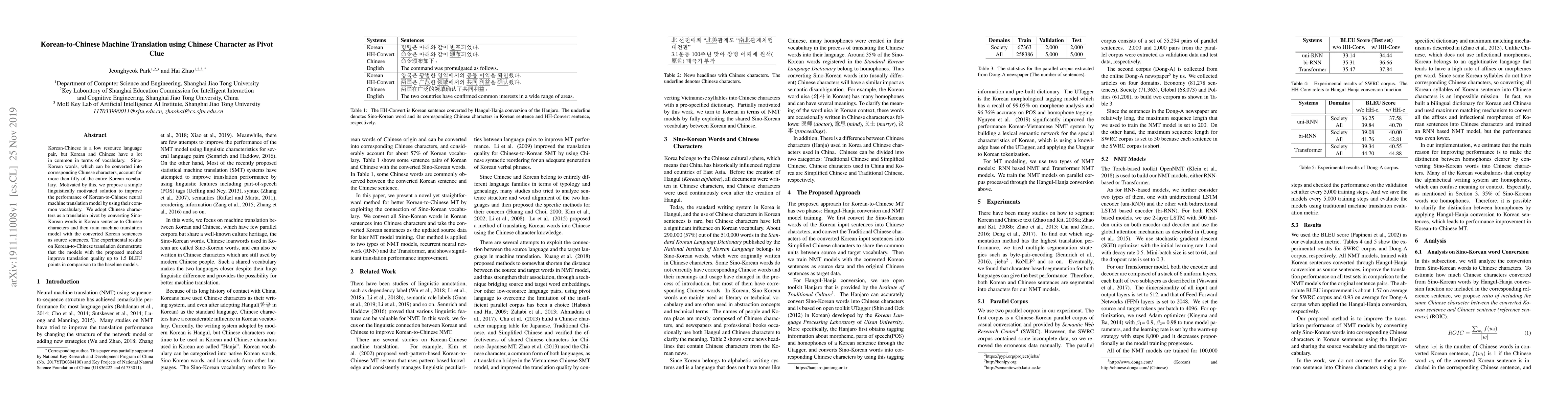 This paper proposes using Chinese characters as a pivot for improving Korean-to-Chinese machine translation, leveraging shared Sino-Korean vocabulary. Experimental results show a 1.5 BLEU point improvement over baseline models.