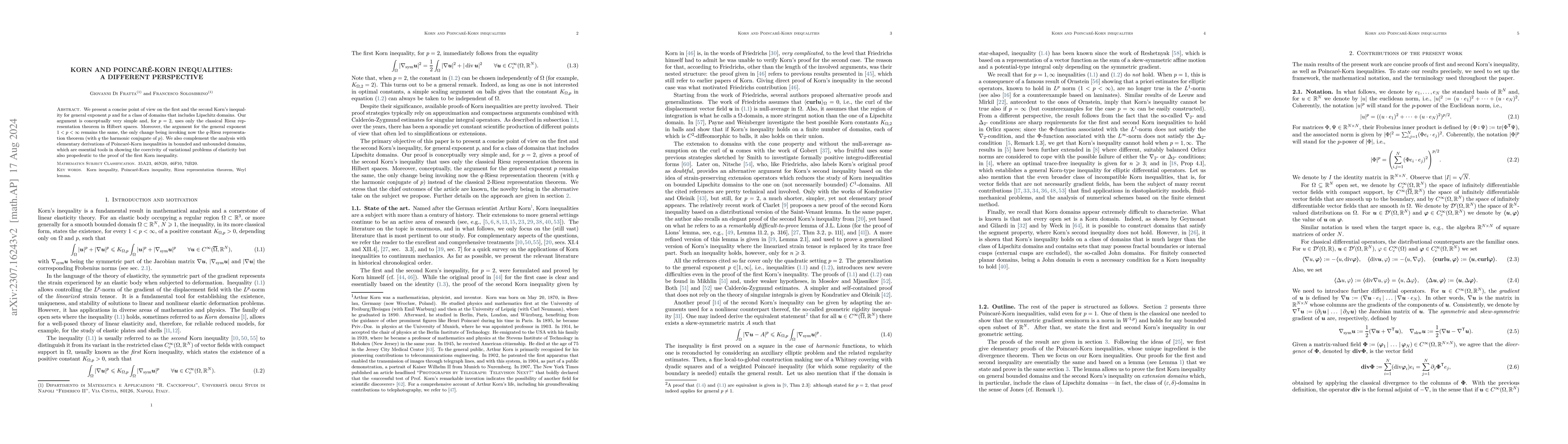 We present a concise point of view on the first and the second Korn's inequality for general exponent $p$ and for a class of domains that includes Lipschitz domains. Our argument is conceptually very simple and, for $p = 2$, uses only the classical Riesz representation theorem in Hilbert spaces. Moreover, the argument for the general exponent $1