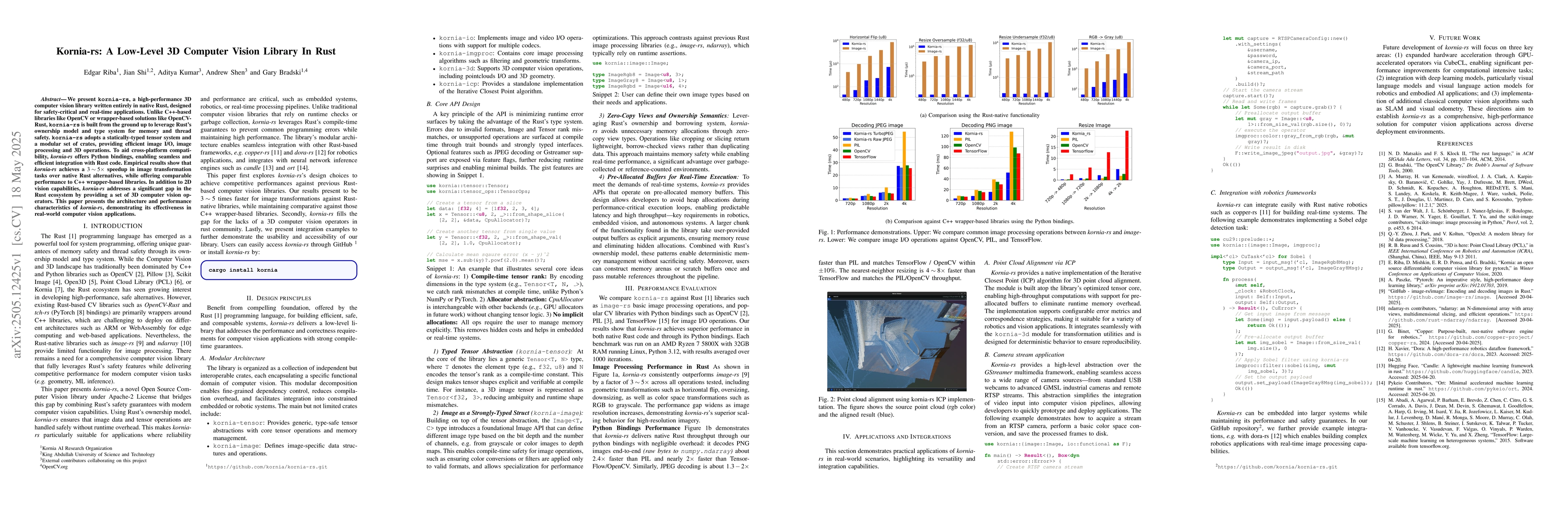 kornia-rs, a Rust-based 3D computer vision library, offers high performance and safety in real-time applications, achieving 3-5 times speedup over native Rust alternatives.