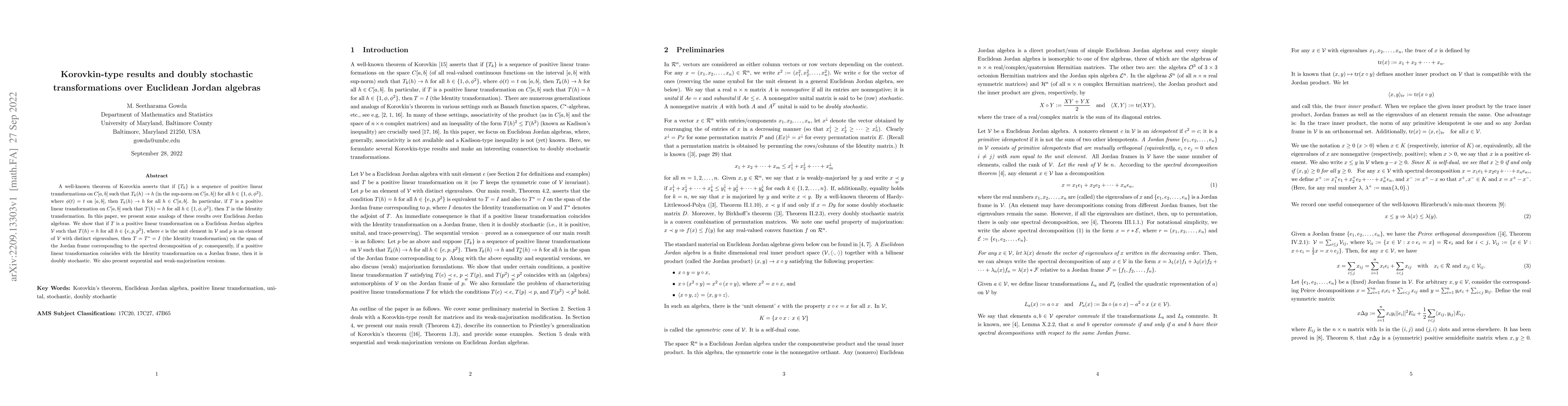 This paper extends Korovkin-type results to Euclidean Jordan algebras, proving that a positive linear transformation coinciding with the Identity on a specific Jordan frame implies it is doubly stochastic. The study also introduces sequential and weak-majorization versions of these results.