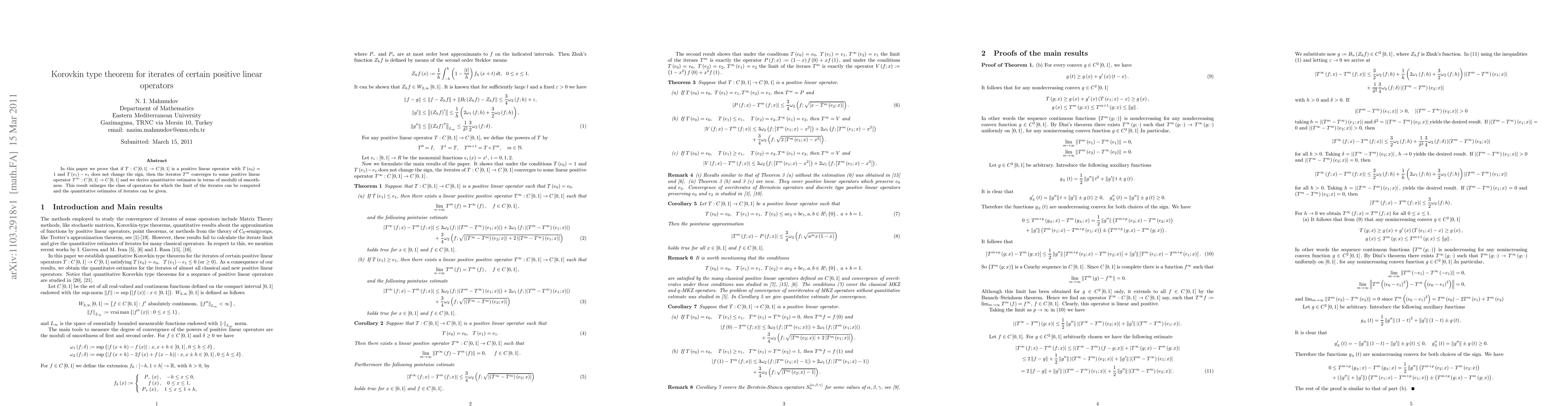 In this paper we prove that if T:C[0,1] \rightarrow C[0,1] is a positive linear operator with T(e_0)=1 and T(e_1)-e_1 does not change the sign, then the iterates T^{m} converges to some positive linear operator T^{\infty} :C[0,1] \rightarrow C[0,1] and we derive quantitative estimates in terms of modulii of smoothness. This result enlarges the class of operators for which the limit of the iterates can be computed and the quantitative estimates of iterates can be given.