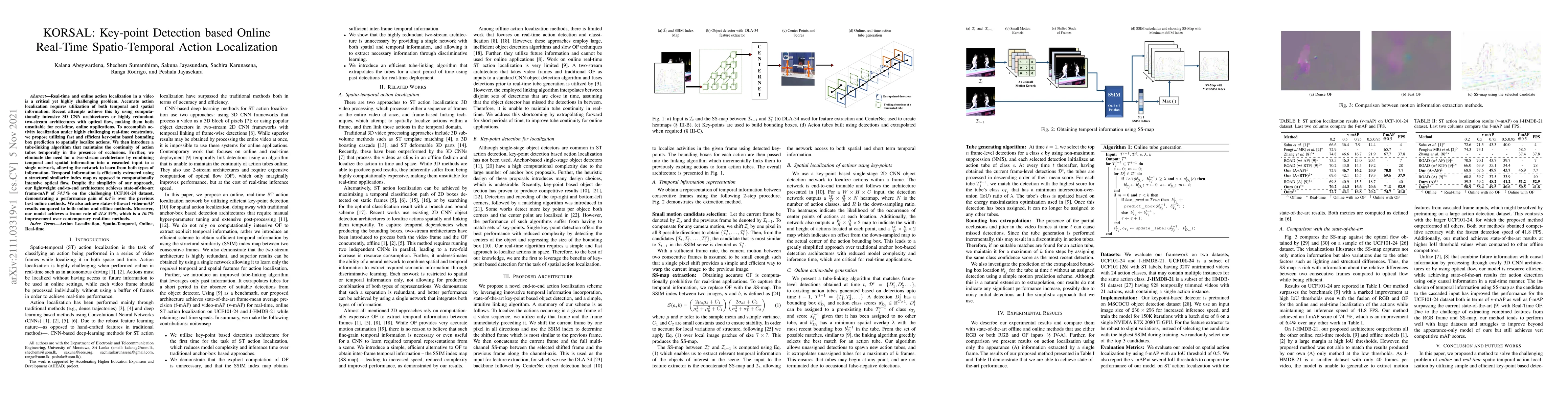 The KORSAL method proposes a fast, efficient key-point detection approach for real-time online action localization in videos, combining spatial and temporal information in a single network to achieve state-of-the-art performance with high frame rates. It outperforms previous methods with a 6.4% gain in frame-mAP and a 10.7% improvement in frame rate.