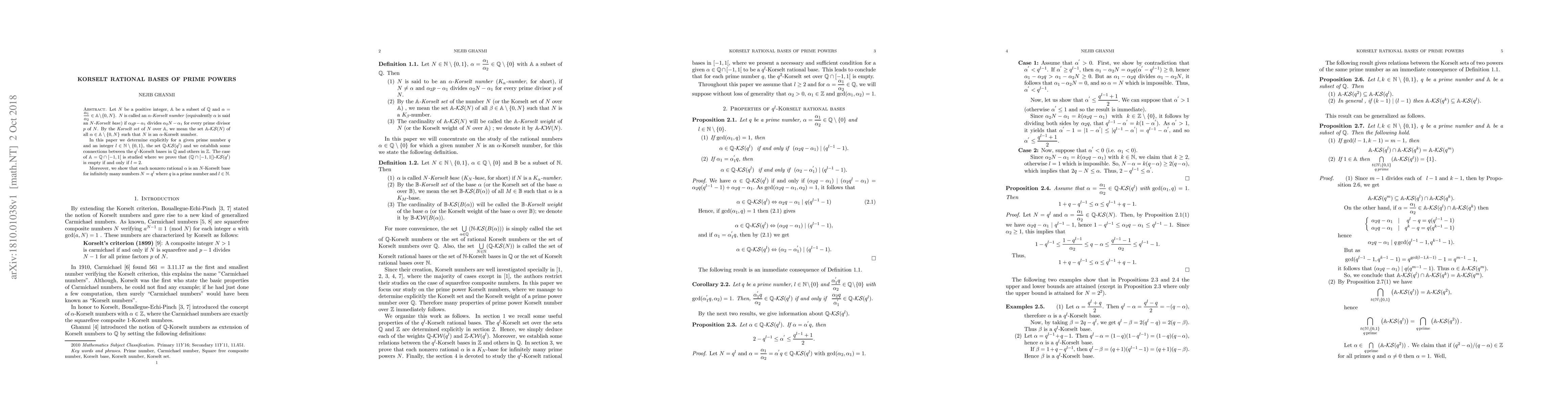 Let $N$ be a positive integer, $\mathbb{A}$ be a subset of $\mathbb{Q}$ and $\alpha=\dfrac{\alpha_{1}}{\alpha_{2}}\in \mathbb{A}\setminus \{0,N\}$. $N$ is called an $\alpha$-Korselt number (equivalently $\alpha$ is said an $N$-Korselt base) if $\alpha_{2}p-\alpha_{1}$ divides $\alpha_{2}N-\alpha_{1}$ for every prime divisor $p$ of $N$. By the Korselt set of $N$ over $\mathbb{A}$, we mean the set $\mathbb{A}$-$\mathcal{KS}(N)$ of all $\alpha\in \mathbb{A}\setminus \{0,N\}$ such that $N$ is an $\alpha$-Korselt number. In this paper we determine explicitly for a given prime number $q$ and an integer $l\in \mathbb{N}\setminus \{0,1\}$, the set $\mathbb{Q}$-$\mathcal{KS}(q^{l})$ and we establish some connections between the $q^{l}$-Korselt bases in $\mathbb{Q}$ and others in $\mathbb{Z}$. The case of $\mathbb{A}=\mathbb{Q}\cap[-1,1[$ is studied where we prove that $(\mathbb{Q}\cap[-1,1[)$-$\mathcal{KS}(q^{l})$ is empty if and only if $l=2$. Moreover, we show that each nonzero rational $\alpha$ is an $N$-Korselt base for infinitely many numbers $N=q^{l}$ where $q$ is a prime number and $l\in\mathbb{N}$.