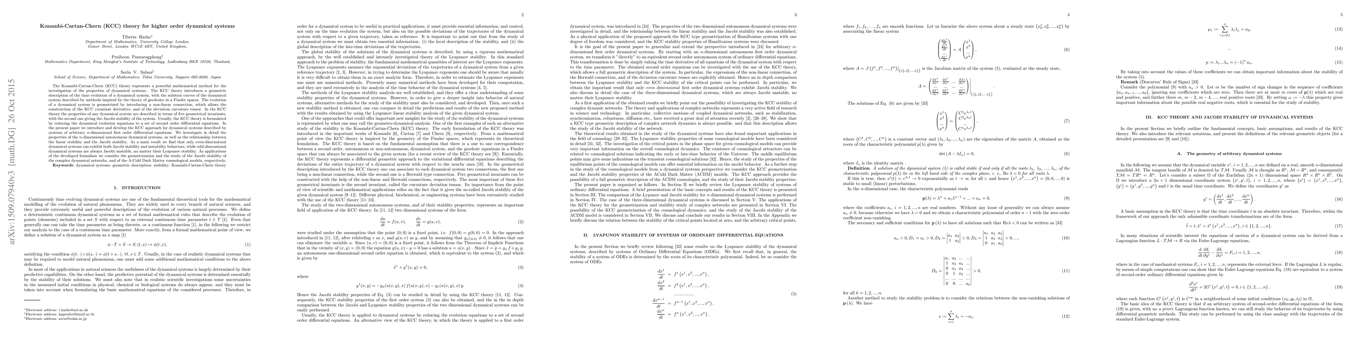 The Kosambi-Cartan-Chern (KCC) theory represents a powerful mathematical method for the investigation of the properties of dynamical systems. The KCC theory introduces a geometric description of the time evolution of a dynamical system, with the solution curves of the dynamical system described by methods inspired by the theory of geodesics in a Finsler spaces. The evolution of a dynamical system is geometrized by introducing a non-linear connection, which allows the construction of the KCC covariant derivative, and of the deviation curvature tensor. In the KCC theory the properties of any dynamical system are described in terms of five geometrical invariants, with the second one giving the Jacobi stability of the system. Usually, the KCC theory is formulated by reducing the dynamical evolution equations to a set of second order differential equations. In the present paper we introduce and develop the KCC approach for dynamical systems described by systems of arbitrary $n$-dimensional first order differential equations. We investigate in detail the properties of the $n$-dimensional autonomous dynamical systems, as well as the relationship between the linear stability and the Jacobi stability. As a main result we find that only even-dimensional dynamical systems can exhibit both Jacobi stability and instability behaviors, while odd-dimensional dynamical systems are always Jacobi unstable, no matter their Lyapunov stability. As applications of the developed formalism we consider the geometrization and the study of the Jacobi stability of the complex dynamical networks, and of the $\Lambda $-Cold Dark Matter cosmological models, respectively.