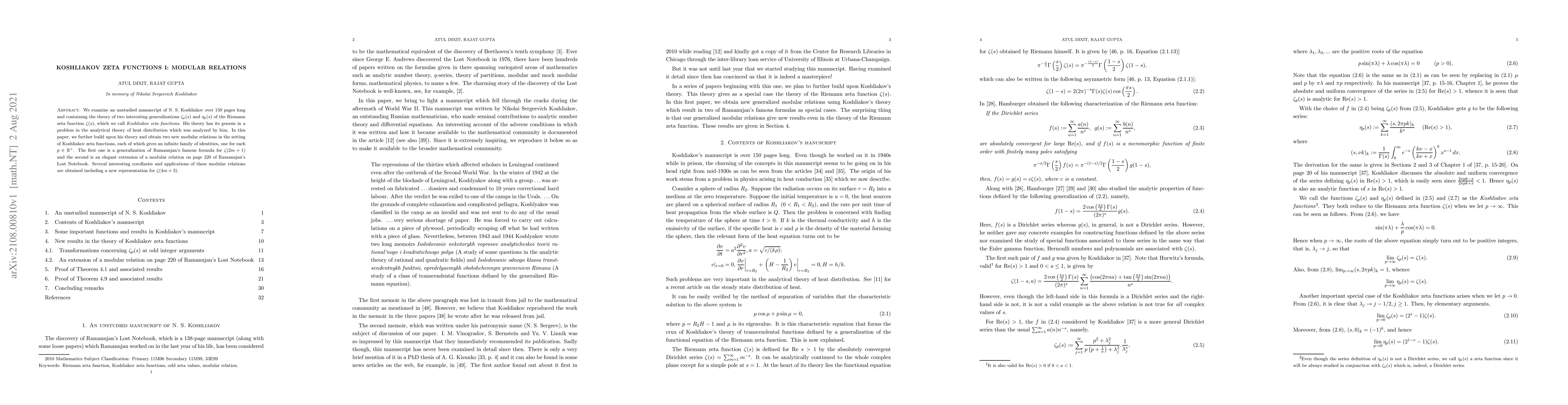 This paper explores an extensive manuscript by N. S. Koshliakov, presenting two novel generalizations of the Riemann zeta function, termed Koshliakov zeta functions. The authors derive new modular relations for these functions, extending Ramanujan’s work, and provide applications including a new representation for $\zeta(4m+3)$.