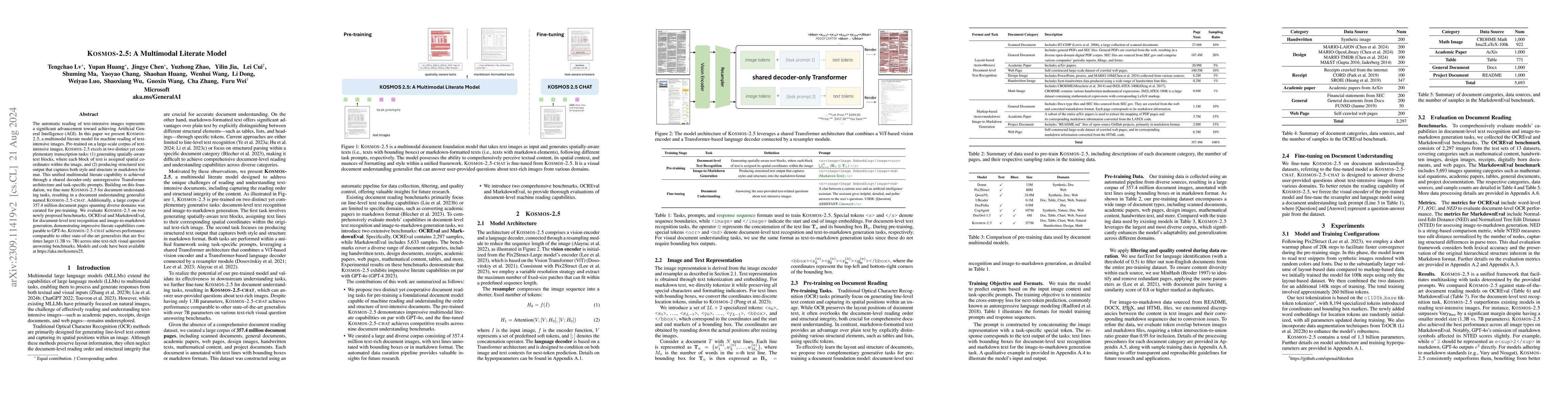 Kosmos-2.5 is a multimodal literate model designed for machine reading of text-intensive images, excelling in spatially-aware text block generation and structured markdown output. It is adaptable for various text-rich image tasks through fine-tuning.
