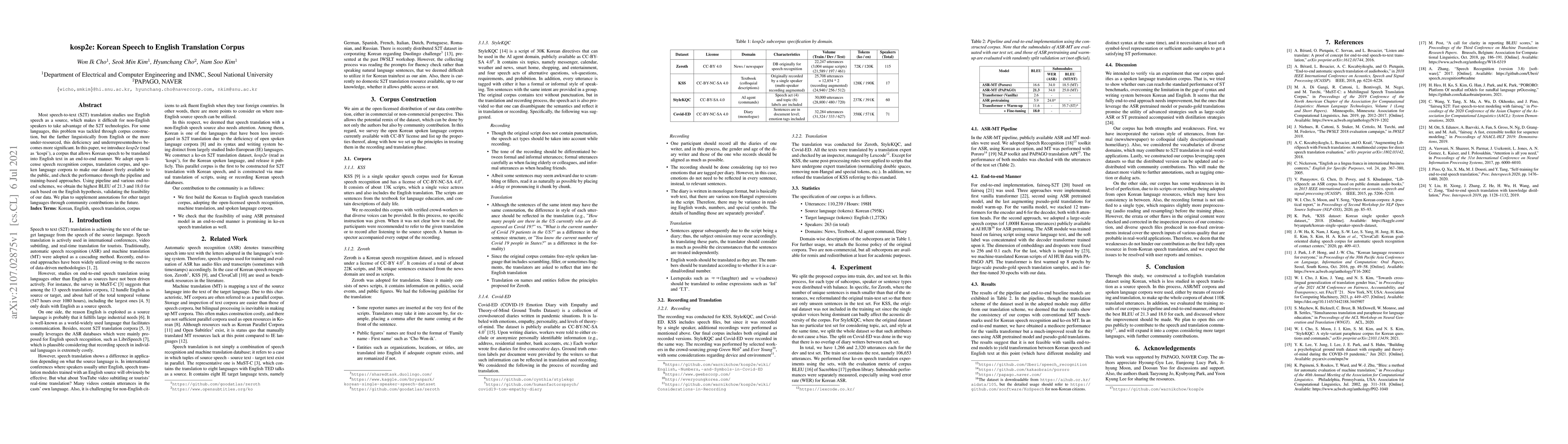 This paper introduces kosp2e, a Korean speech-to-English translation corpus designed to address the lack of resources for non-English speech-to-text technologies. The corpus, created using open-licensed data, achieves a BLEU score of 21.3 and 18.0 through pipeline and end-to-end methods, respectively, demonstrating its effectiveness.