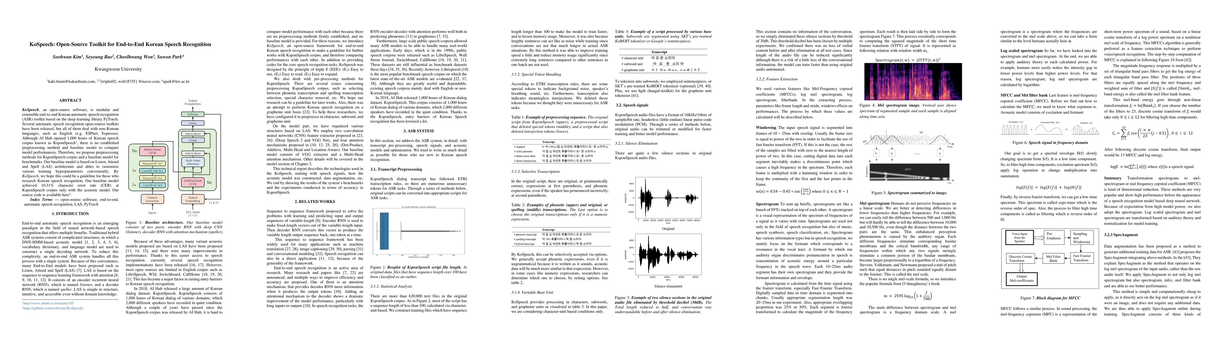KoSpeech introduces an open-source toolkit for Korean automatic speech recognition, offering preprocessing methods for the KsponSpeech corpus and a baseline model based on the LAS architecture, achieving a 10.31% character error rate. The modular toolkit aims to guide future Korean speech recognition research.