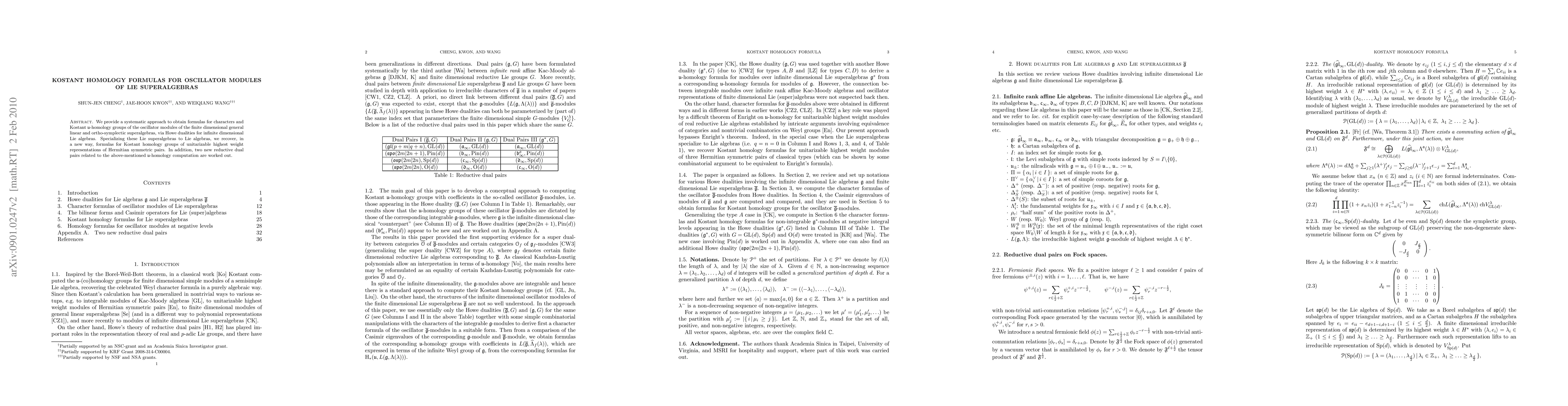We provide a systematic approach to obtain formulas for characters and Kostant ${\mathfrak u}$-homology groups of the oscillator modules of the finite dimensional general linear and ortho-symplectic superalgebras, via Howe dualities for infinite dimensional Lie algebras. Specializing these Lie superalgebras to Lie algebras, we recover, in a new way, formulas for Kostant homology groups of unitarizable highest weight representations of Hermitian symmetric pairs. In addition, two new reductive dual pairs related to the above-mentioned ${\mathfrak u}$-homology computation are worked out.