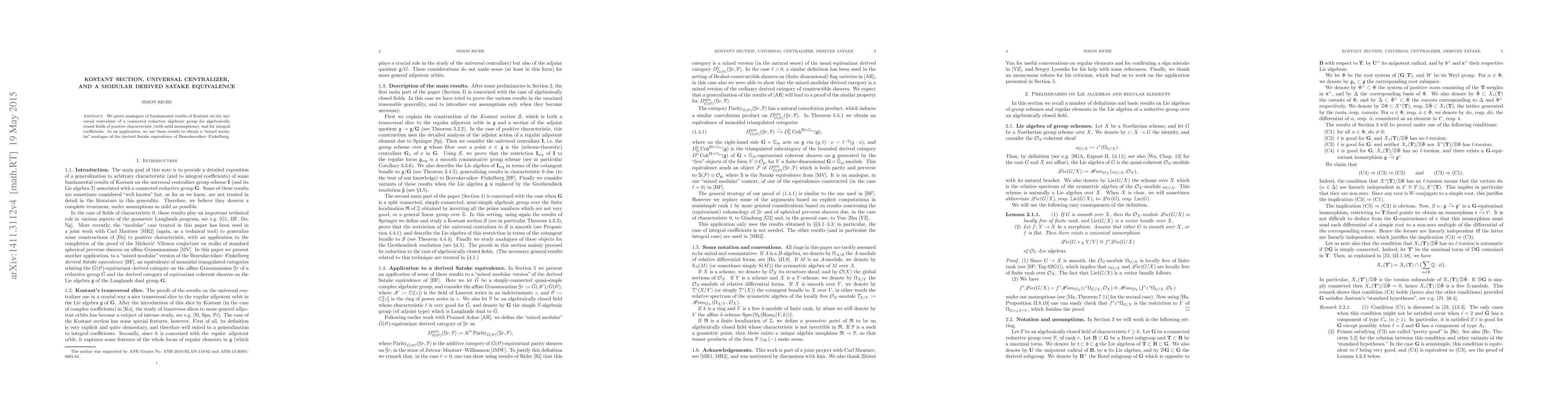This paper proves analogues of Kostant's results for universal centralizers in positive characteristic fields and integral coefficients, with implications for the derived Satake equivalence in modular representations.
