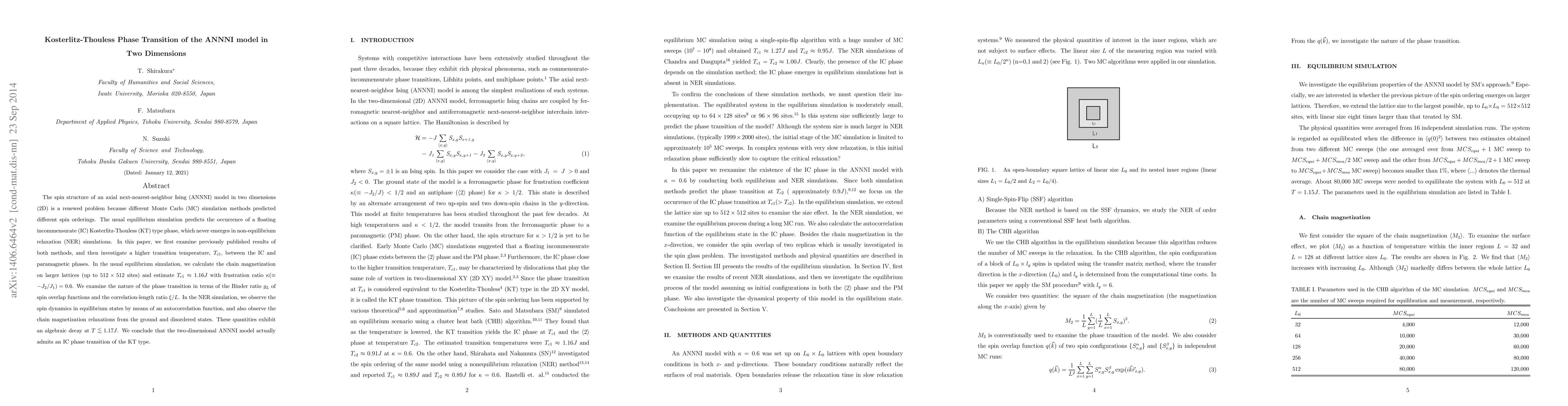 The spin structure of an axial next-nearest-neighbor Ising (ANNNI) model in two dimensions (2D) is a renewed problem because different Monte Carlo (MC) simulation methods predicted different spin orderings. The usual equilibrium simulation predicts the occurrence of a floating incommensurate (IC) Kosterlitz-Thouless (KT) type phase, which never emerges in non-equilibrium relaxation (NER) simulations. In this paper, we first examine previously published results of both methods, and then investigate a higher transition temperature, $T_{c1}$, between the IC and paramagnetic phases. In the usual equilibrium simulation, we calculate the layer magnetization on larger lattices (up to $512 \times 512$ sites) and estimate $T_{c1} \approx 1.16J$ with frustration ratio $\kappa (\equiv -J_2/J_1) = 0.6$. We examine the nature of the phase transition in terms of the Binder ratio $g_L$ of spin overlap functions and the correlation-length ratio $\xi/L$. In the NER simulation, we observe the spin dynamics in equilibrium states by means of an autocorrelation function, and also observe the layer magnetization relaxations from the ground and disordered states. These quantities exhibit an algebraic decay at $T \lesssim 1.17J$. We conclude that the two-dimensional ANNNI model actually admits an IC phase transition of the KT type.