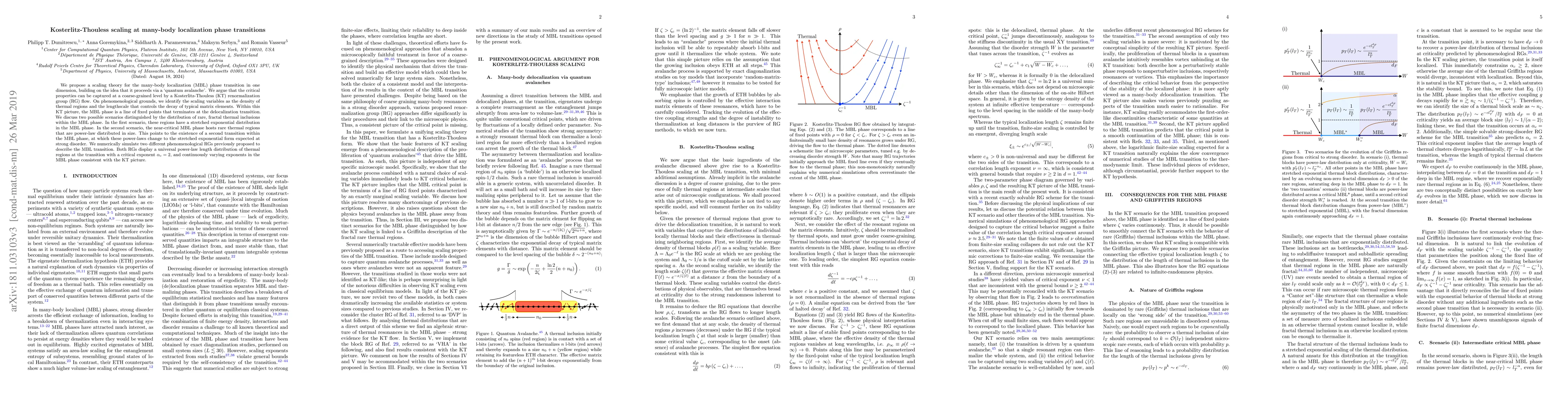This paper proposes a Kosterlitz-Thouless scaling theory for the many-body localization phase transition in one dimension, suggesting it proceeds via a 'quantum avalanche'. It identifies scaling variables and discusses two scenarios for the distribution of thermal regions, indicating a potential second transition within the MBL phase.