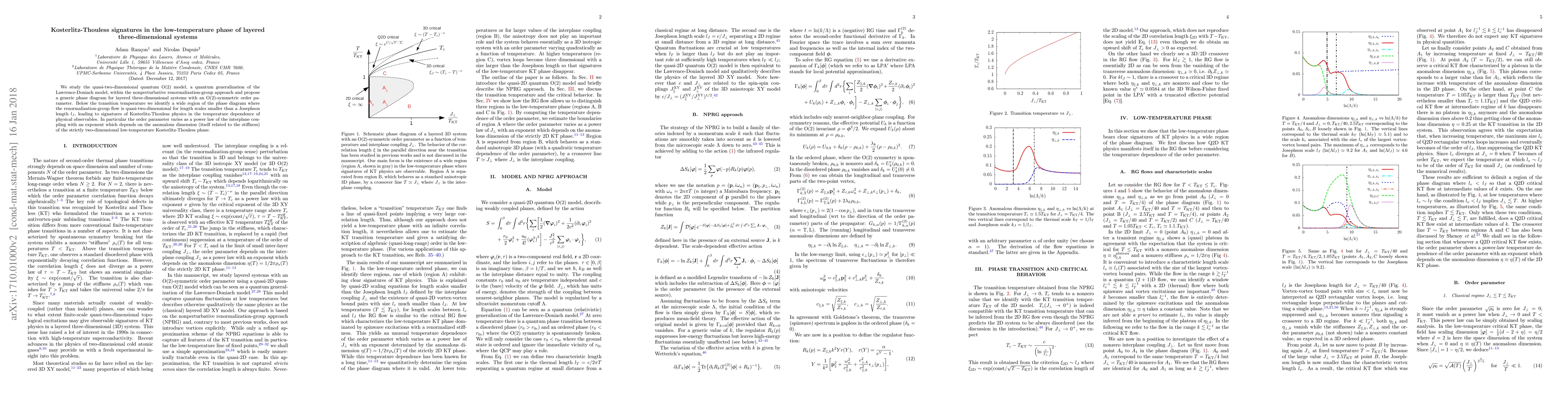 We study the quasi-two-dimensional quantum O(2) model, a quantum generalization of the Lawrence-Doniach model, within the nonperturbative renormalization-group approach and propose a generic phase diagram for layered three-dimensional systems with an O(2)-symmetric order parameter. Below the transition temperature we identify a wide region of the phase diagram where the renormalization-group flow is quasi-two-dimensional for length scales smaller than a Josephson length $l_J$, leading to signatures of Kosterlitz-Thouless physics in the temperature dependence of physical observables. In particular the order parameter varies as a power law of the interplane coupling with an exponent which depends on the anomalous dimension (itself related to the stiffness) of the strictly two-dimensional low-temperature Kosterlitz-Thouless phase.