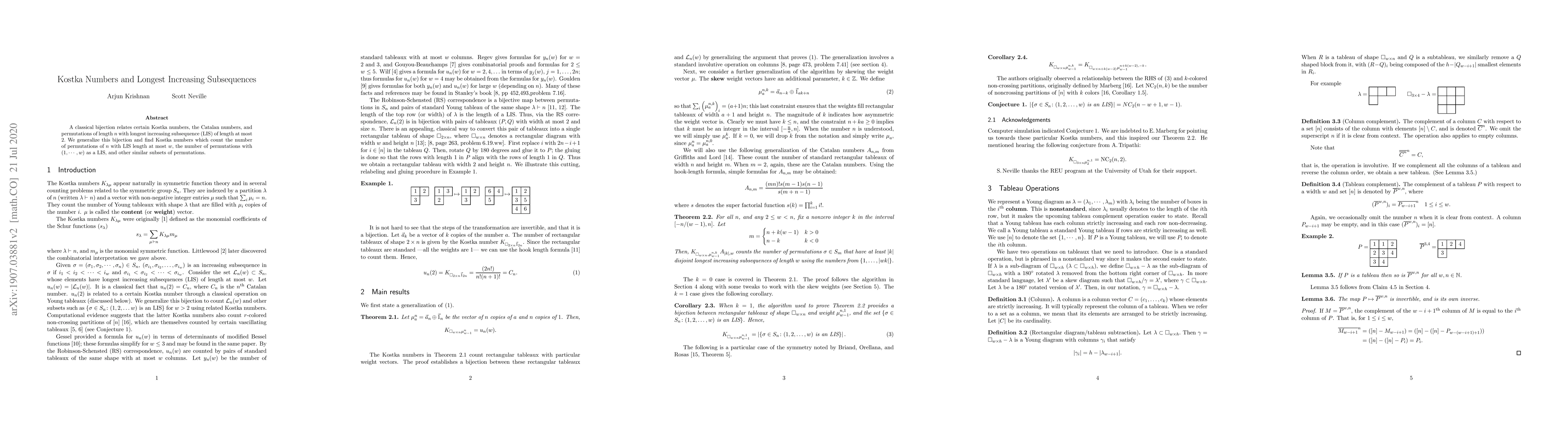 A classical bijection relates certain Kostka numbers, the Catalan numbers, and permutations of length $n$ with longest increasing subsequence (LIS) of length at most $2.$ We generalize this bijection and find Kostka numbers which count the number of permutations of $n$ with LIS length at most $w,$ the number of permutations with $(1, \cdots, w)$ as a LIS, and other similar subsets of permutations.