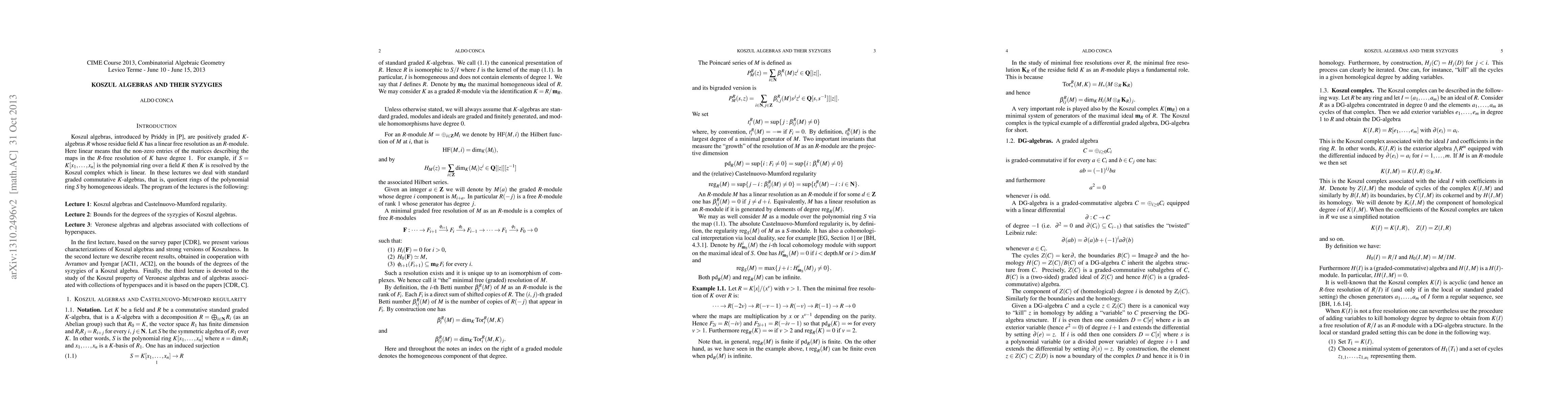 This paper introduces Koszul algebras, graded K-algebras with linear free resolutions, and discusses their characterization by Castelnuovo-Mumford regularity. It also covers recent findings on the syzygies of these algebras and explores the Koszul property in Veronese algebras and algebras related to hyperspaces.