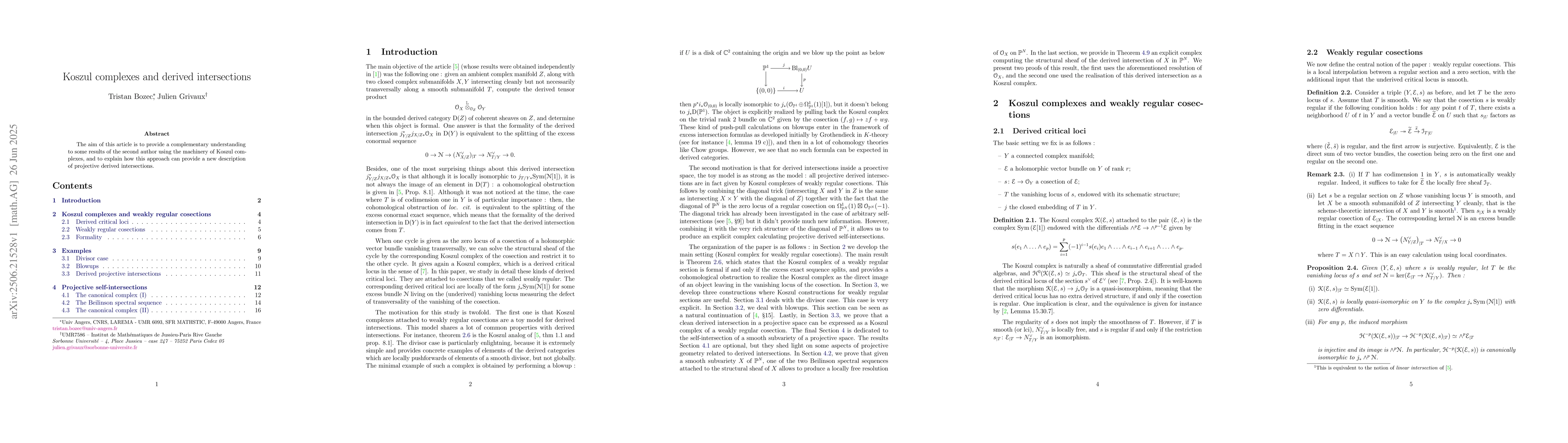 The aim of this article is to provide a complementary understanding to some results of the second author using the machinery of Koszul complexes, and to explain how this approach can provide a new description of projective derived intersections.