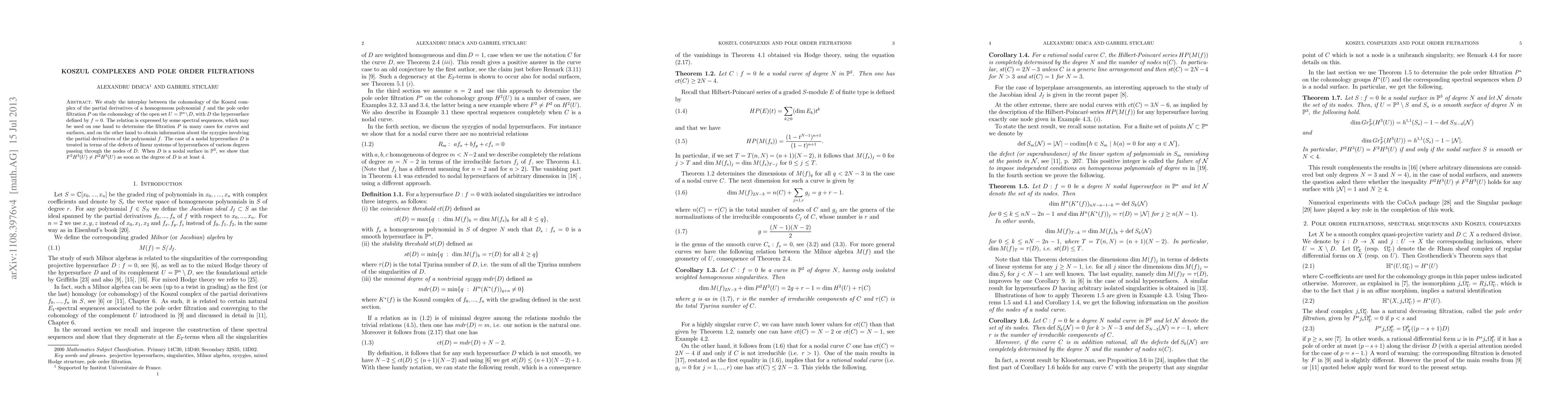 We study the interplay between the cohomology of the Koszul complex of the partial derivatives of a homogeneous polynomial $f$ and the pole order filtration $P$ on the cohomology of the open set $U=\PP^n \setminus D$, with $D$ the hypersurface defined by $f=0$. The relation is expressed by some spectral sequences, which may be used on one hand to determine the filtration $P$ in many cases for curves and surfaces, and on the other hand to obtain information about the syzygies involving the partial derivatives of the polynomial $f$. The case of a nodal hypersurface $D$ is treated in terms of the defects of linear systems of hypersurfaces of various degrees passing through the nodes of $D$. When $D$ is a nodal surface in $\PP^3$, we show that $F^2H^3(U) \ne P^2H^3(U)$ as soon as the degree of $D$ is at least 4.